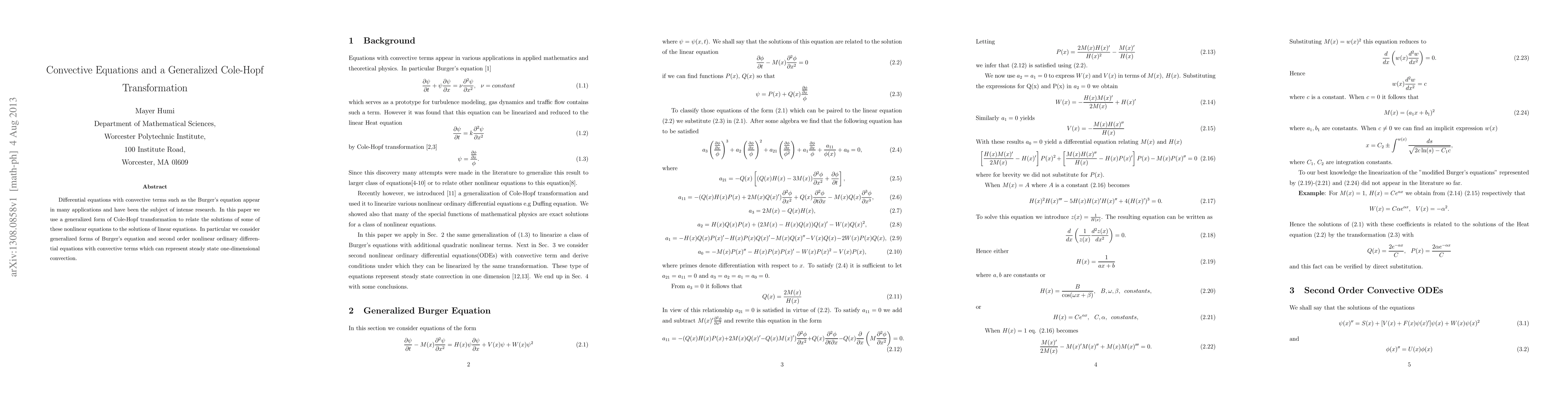 Differential equations with convective terms such as the Burger's equation appear in many applications and have been the subject of intense research. In this paper we use a generalized form of Cole-Hopf transformation to relate the solutions of some of these nonlinear equations to the solutions of linear equations. In particular we consider generalized forms of Burger's equation and second order nonlinear ordinary differential equations with convective terms which can represent steady state one-dimensional convection.