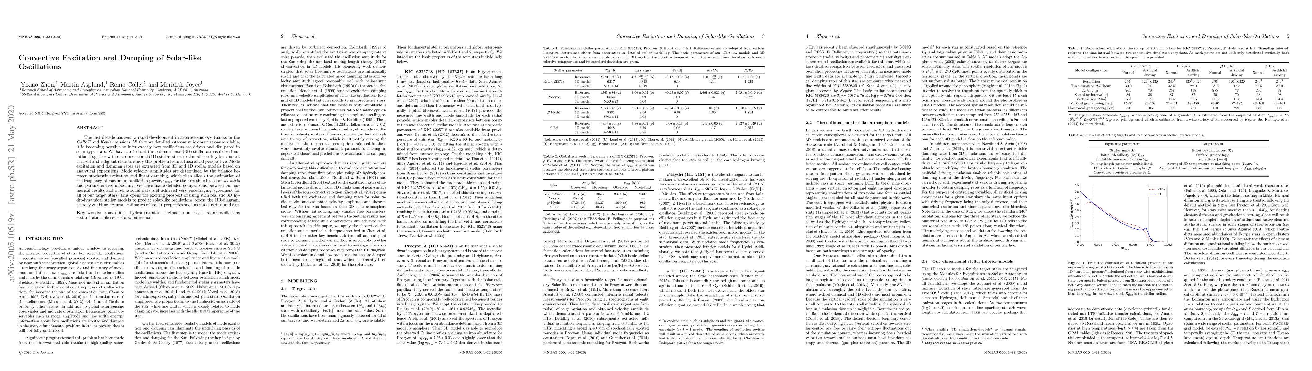 This paper explores the mechanisms driving and dissipating solar-like oscillations in solar-type stars using 3D simulations and 1D models, achieving good agreement with observational data. The study enables accurate predictions of stellar properties like mass, radius, and age based on ab initio modelling.