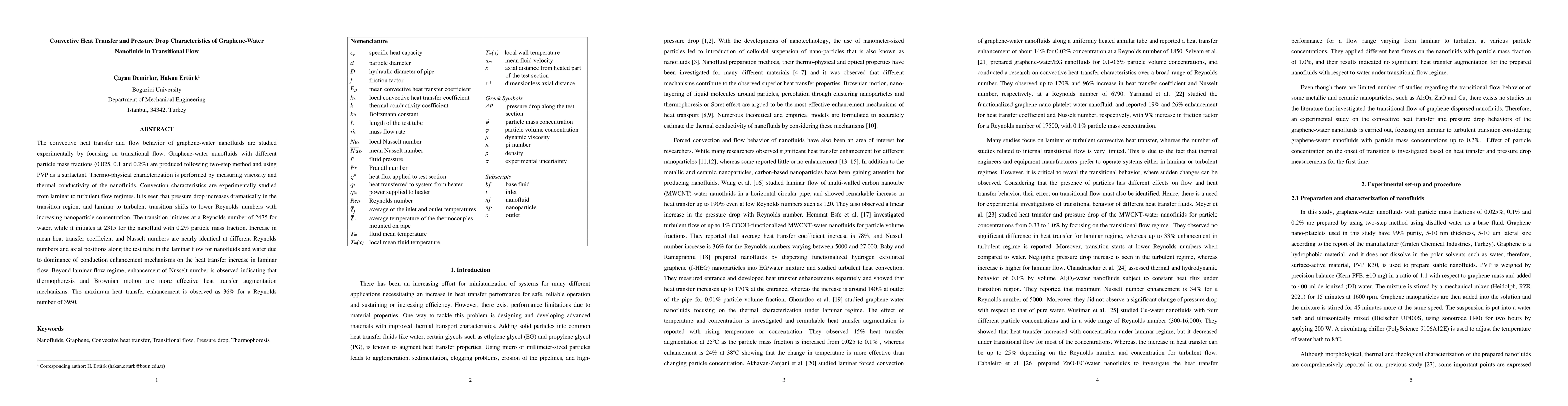 This study experimentally investigates the convective heat transfer and pressure drop of graphene-water nanofluids in transitional flow regimes, finding that pressure drop increases significantly during transition and that heat transfer enhancement peaks at 36% beyond laminar flow due to thermophoresis and Brownian motion.