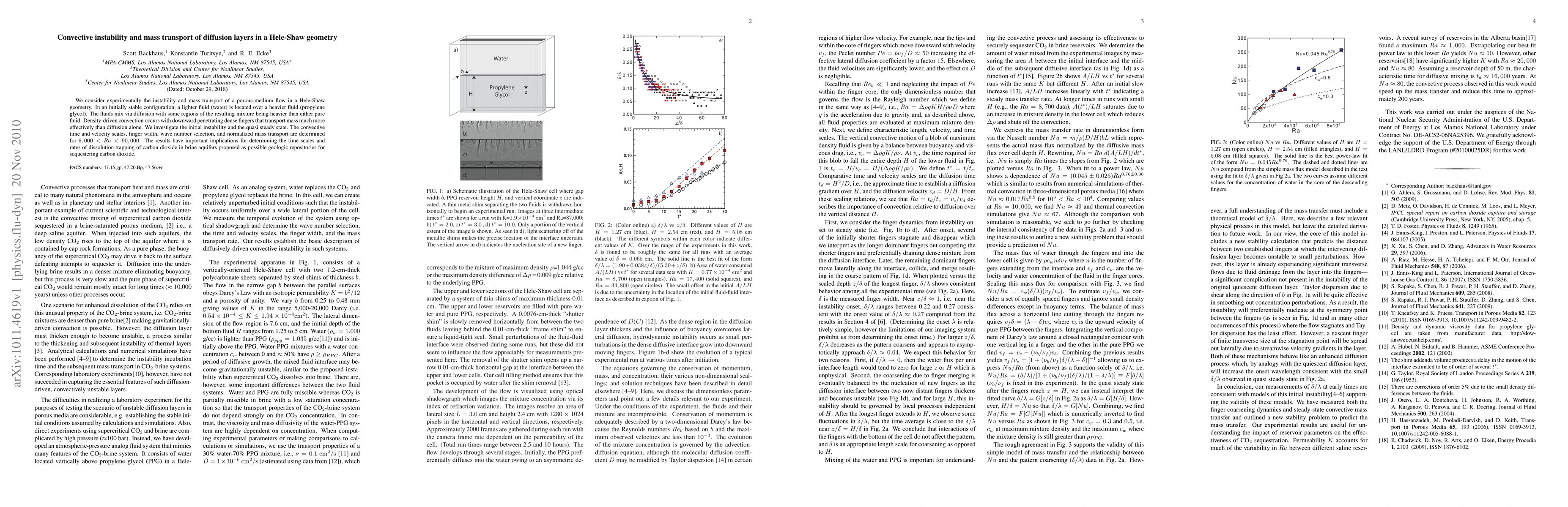 This study experimentally examines the convective instability and mass transport in a Hele-Shaw cell where water overlays propylene glycol, leading to density-driven convection. The research determines the convective time scales, finger width, and mass transport rates, providing insights into carbon dioxide sequestration in brine aquifers.