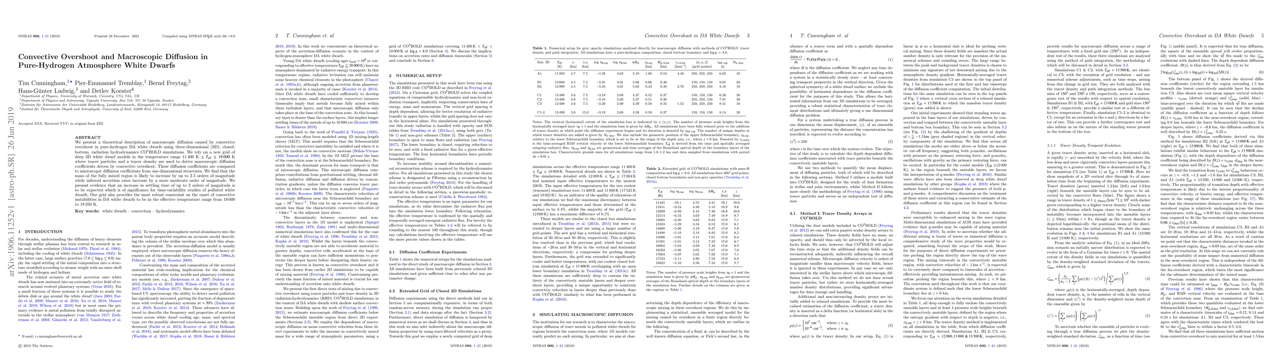 This paper investigates macroscopic diffusion in pure-hydrogen DA white dwarfs driven by convective overshoot, using advanced 3D radiation hydrodynamics simulations. The study finds that convective overshoot significantly increases the mass of the mixed region and accretion rates, while also extending settling times, which impacts time-variability studies.