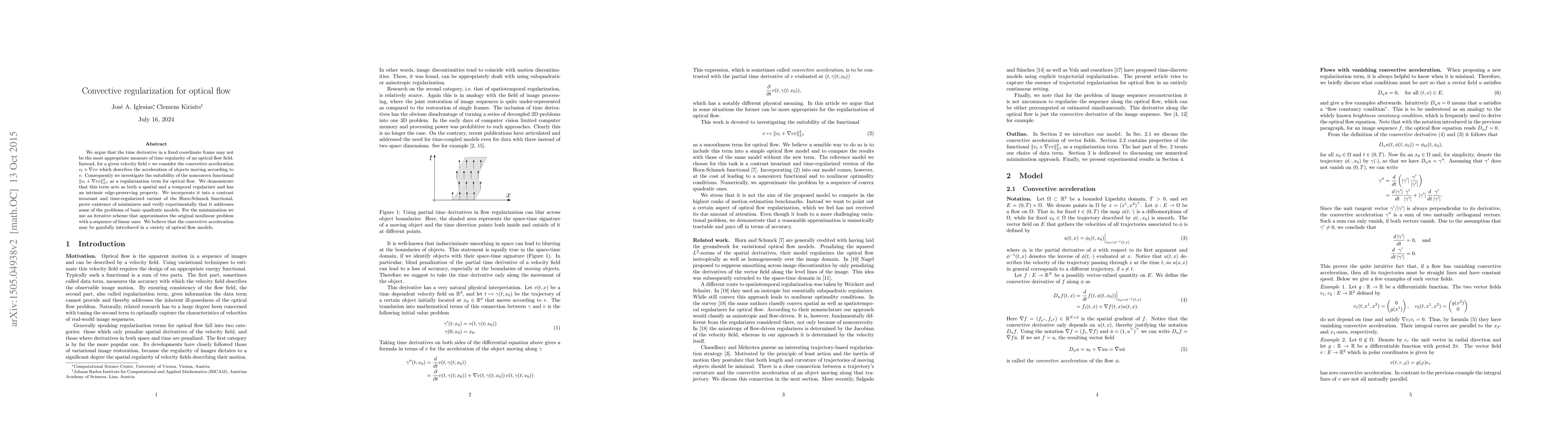 We argue that the time derivative in a fixed coordinate frame may not be the most appropriate measure of time regularity of an optical flow field. Instead, for a given velocity field $v$ we consider the convective acceleration $v_t + \nabla v v$ which describes the acceleration of objects moving according to $v$. Consequently we investigate the suitability of the nonconvex functional $\|v_t + \nabla v v\|^2_{L^2}$ as a regularization term for optical flow. We demonstrate that this term acts as both a spatial and a temporal regularizer and has an intrinsic edge-preserving property. We incorporate it into a contrast invariant and time-regularized variant of the Horn-Schunck functional, prove existence of minimizers and verify experimentally that it addresses some of the problems of basic quadratic models. For the minimization we use an iterative scheme that approximates the original nonlinear problem with a sequence of linear ones. We believe that the convective acceleration may be gainfully introduced in a variety of optical flow models.
