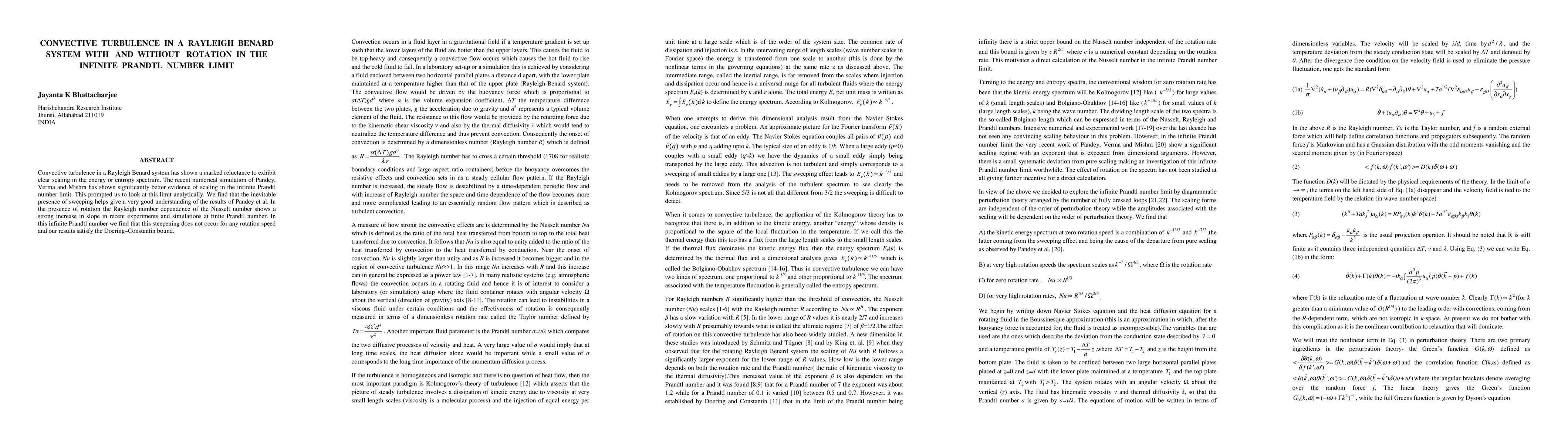 Convective turbulence in a Rayleigh Benard system has shown a marked reluctance to exhibit clear scaling in the energy or entropy spectrum. The recent numerical simulation of Pandey, Verma and Mishra has shown significantly better evidence of scaling in the infinite Prandtl number limit. This prompted us to look at this limit analytically. We find that the inevitable presence of sweeping helps give a very good understanding of the results of Pandey et. al. In the presence of rotation, the Rayleigh number dependence of the Nusselt number shows a strong increase in slope in recent experiments and simulations at finite Prandtl number. In the infinite Prandtl number case we find that this steepening does not occur for any rotation speed and our results satisfy the Doering-Constantin bound.