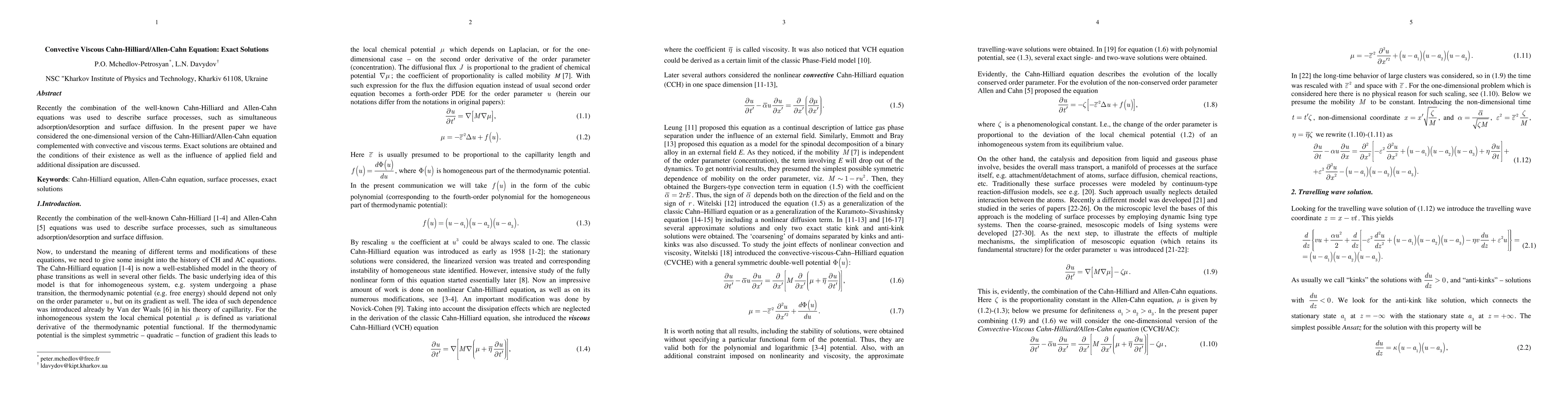 This paper explores exact solutions for a one-dimensional convective viscous Cahn-Hilliard/Allen-Cahn equation, analyzing the conditions for their existence and the effects of applied fields and additional dissipation on surface processes like adsorption/desorption and surface diffusion.