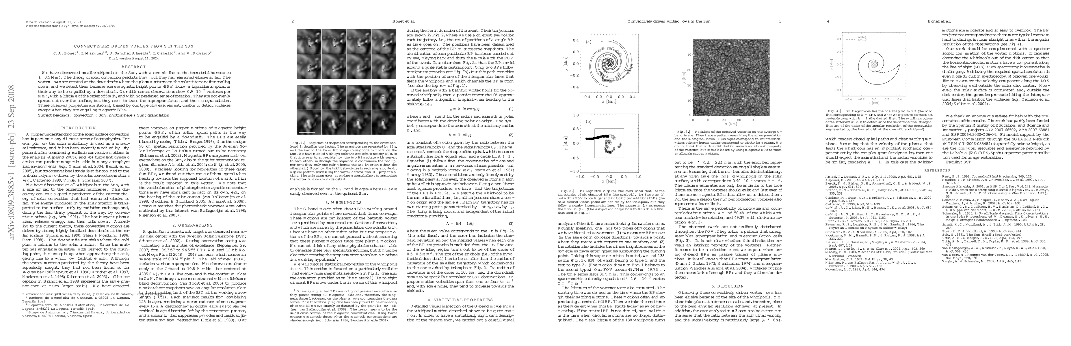 We have discovered small whirlpools in the Sun, with a size similar to the terrestrial hurricanes (<~0.5 Mm). The theory of solar convection predicts them, but they had remained elusive so far. The vortex flows are created at the downdrafts where the plasma returns to the solar interior after cooling down, and we detect them because some magnetic bright points (BPs) follow a logarithmic spiral in their way to be engulfed by a downdraft. Our disk center observations show 0.009 vortexes per Mm^2, with a lifetime of the order of 5 min, and with no preferred sense of rotation. They are not evenly spread out over the surface, but they seem to trace the supergranulation and the mesogranulation. These observed properties are strongly biased by our type of measurement, unable to detect vortexes except when they are engulfing magnetic BPs.