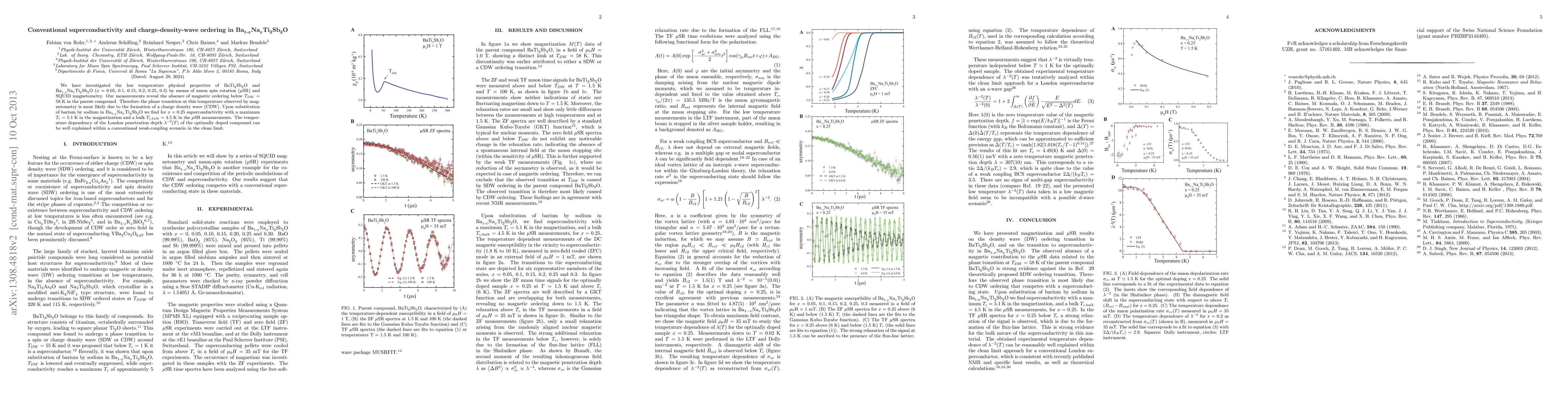 This study investigates the low-temperature properties of BaTi2Sb2O and its sodium-substituted variants using muSR and SQUID magnetometry, revealing charge-density-wave ordering in the parent compound and conventional superconductivity in Ba0.75Na0.25Ti2Sb2O with a critical temperature of 4.5 K. The findings align with a weak-coupling superconductivity model.