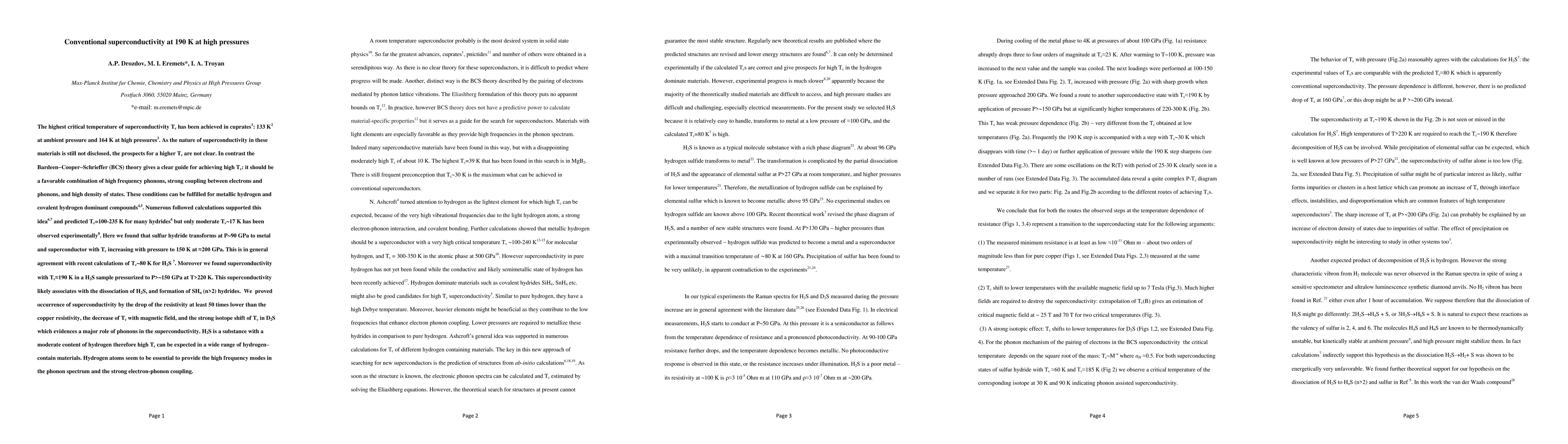 This paper reports the discovery of superconductivity in sulfur hydride at unprecedented high temperatures, reaching 190 K at pressures over 150 GPa, likely due to the formation of SHn hydrides. The findings align with theoretical predictions and suggest that hydrogen-containing materials may exhibit similarly high critical temperatures.