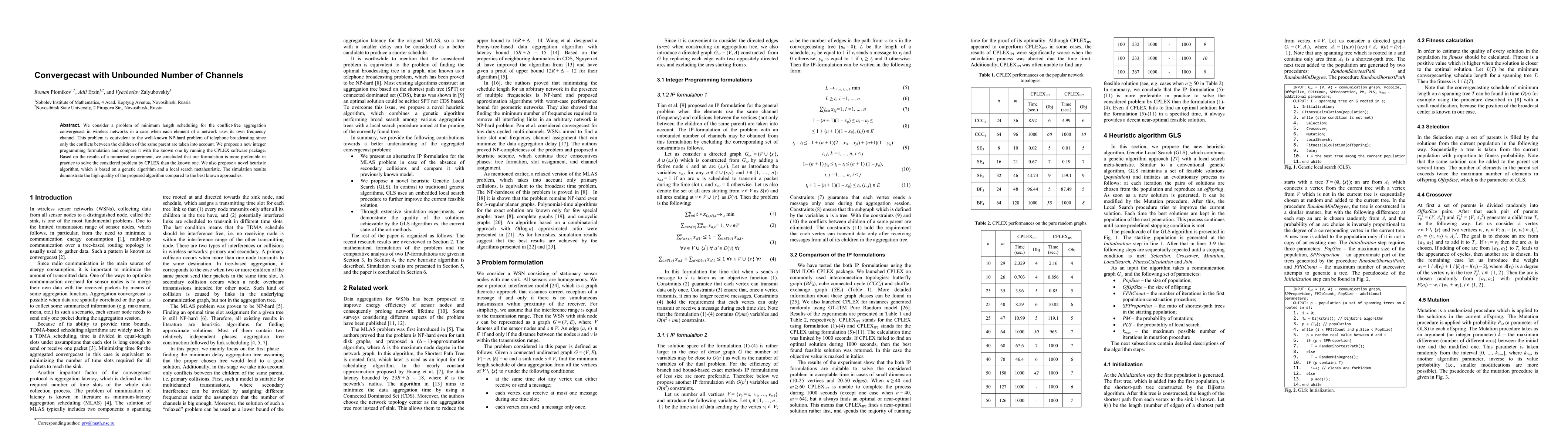 We consider a problem of minimum length scheduling for the conflict-free aggregation convergecast in wireless networks in a case when each element of a network uses its own frequency channel. This problem is equivalent to the well-known NP-hard problem of telephone broadcasting since only the conflicts between the children of the same parent are taken into account. We propose a new integer programming formulation and compare it with the known one by running the CPLEX software package. Based on the results of a numerical experiment, we concluded that our formulation is more preferable in practice to solve the considered problem by CPLEX than the known one. We also propose a novel heuristic algorithm, which is based on a genetic algorithm and a local search metaheuristic. The simulation results demonstrate the high quality of the proposed algorithm compared to the best known approaches.