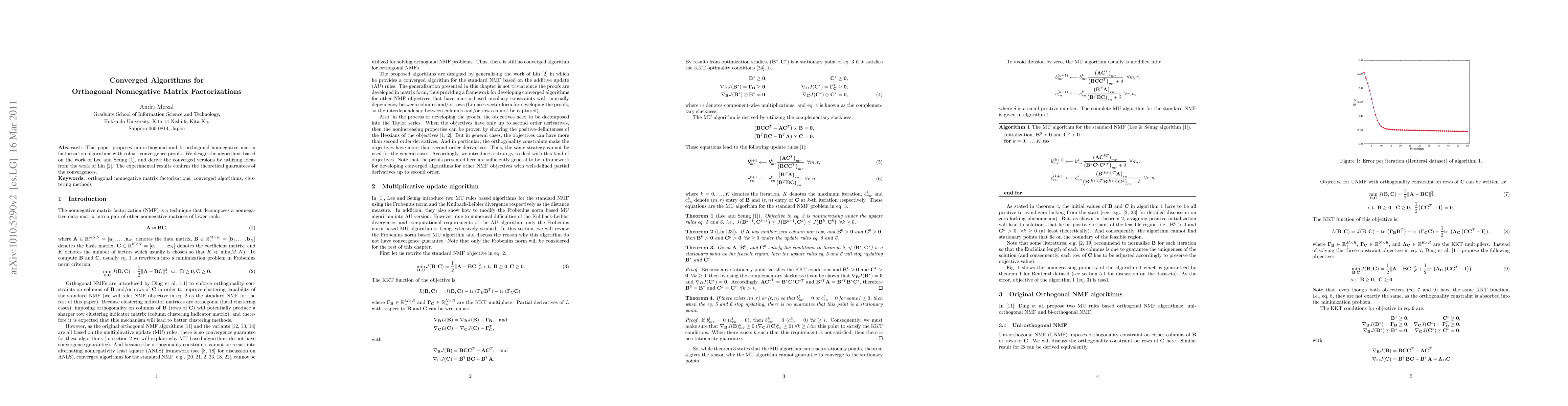 This paper introduces uni-orthogonal and bi-orthogonal nonnegative matrix factorization algorithms, supported by robust convergence proofs, derived from Lee and Seung’s and Lin’s methodologies, with experimental validation of theoretical convergence.