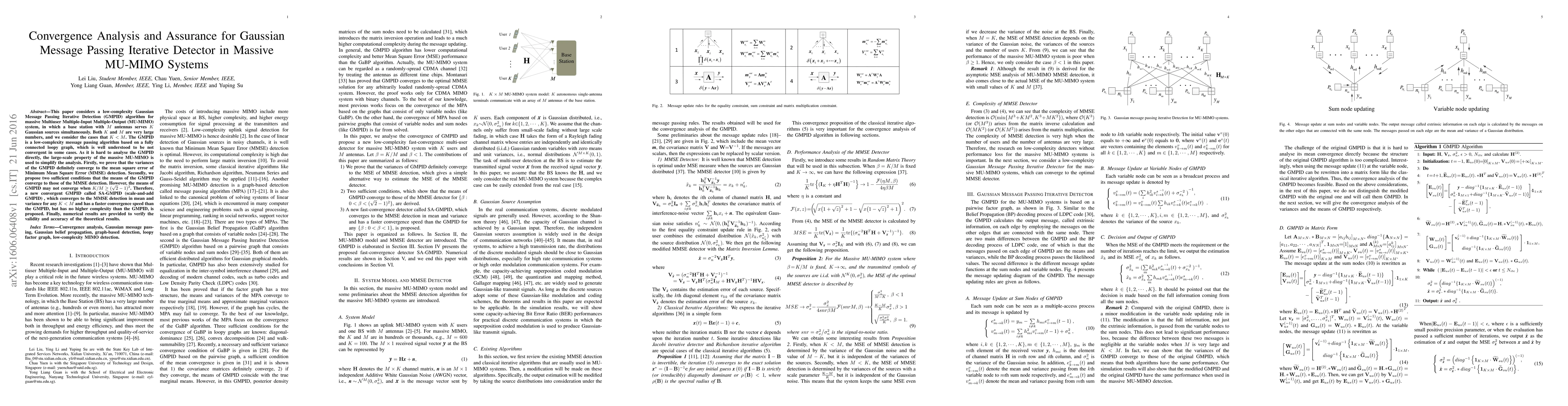 This paper proposes a low-complexity Gaussian Message Passing Iterative Detection (GMPID) algorithm for massive MU-MIMO systems, proving convergence of variances and means for large-scale scenarios. A new SA-GMPID method is introduced that guarantees convergence in mean and variance for any $K < M$ with faster speed but no increased complexity.