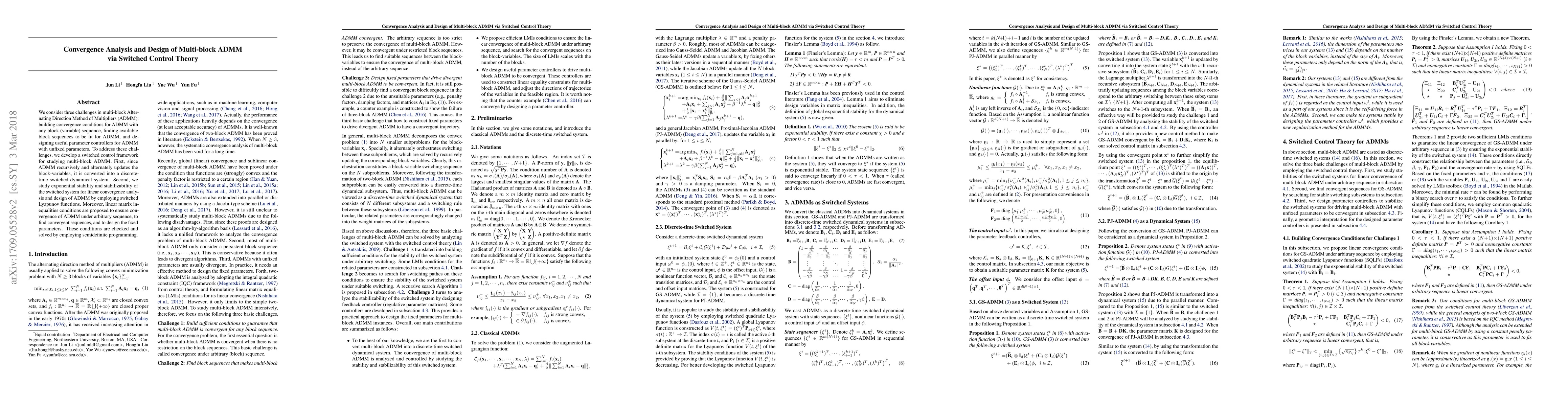 This paper develops a switched control framework for analyzing and designing multi-block ADMM, addressing convergence conditions, suitable block sequences, and parameter controllers. It employs switched Lyapunov functions and linear matrix inequalities to ensure convergence and proposes semidefinite programming for solving these conditions.