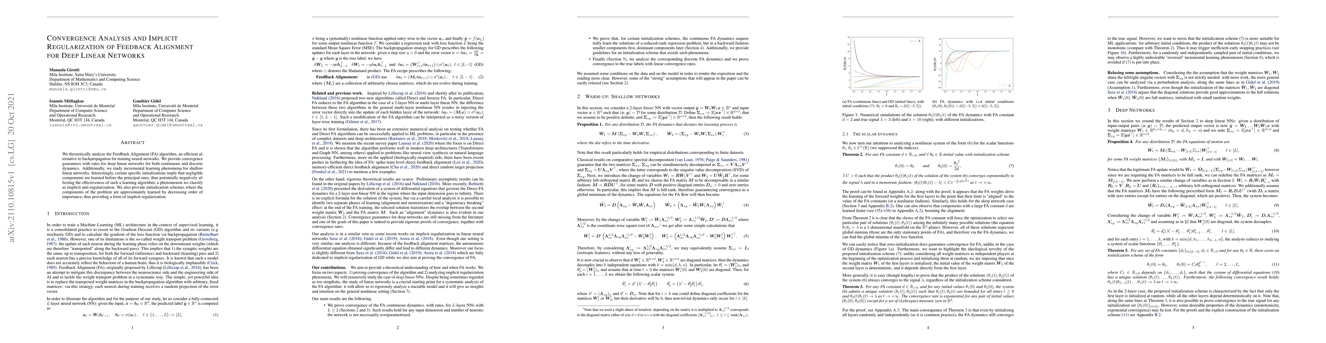 This paper analyzes the Feedback Alignment (FA) algorithm for training deep linear networks, providing convergence guarantees and studying implicit regularization effects. It identifies implicit anti-regularization in specific initializations but also proposes initialization schemes that promote implicit regularization, learning components in order of importance.