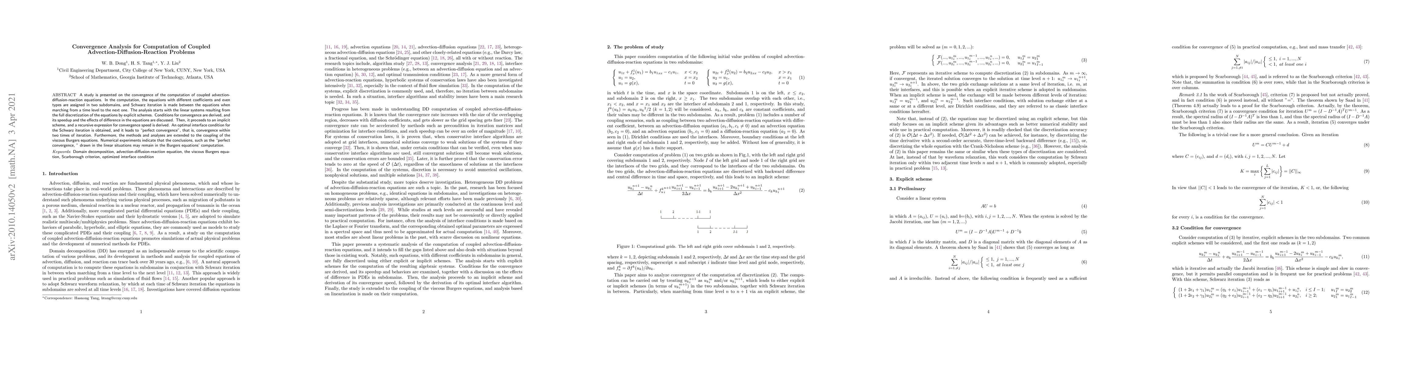 This paper analyzes the convergence of numerical methods for solving coupled advection-diffusion-reaction problems using Schwarz iteration. It derives conditions for convergence and optimal interface conditions leading to "perfect convergence" within two iterations, extending the analysis to viscous Burgers equations.