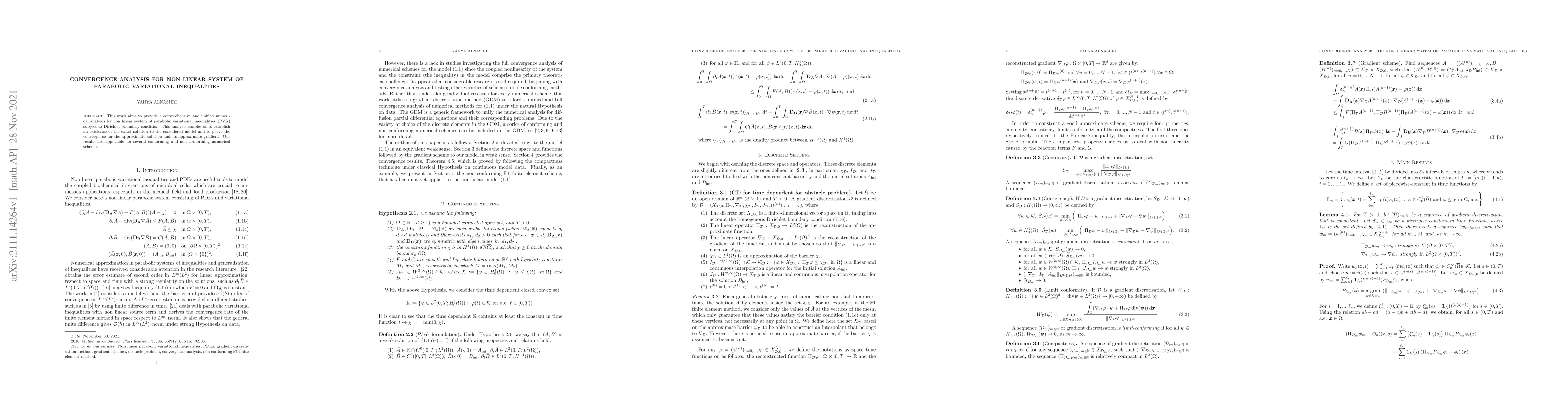 This paper presents a detailed numerical analysis for nonlinear parabolic variational inequalities, establishing the existence of solutions and proving convergence for both approximate solutions and their gradients. The results are relevant for various conforming and non-conforming numerical schemes.