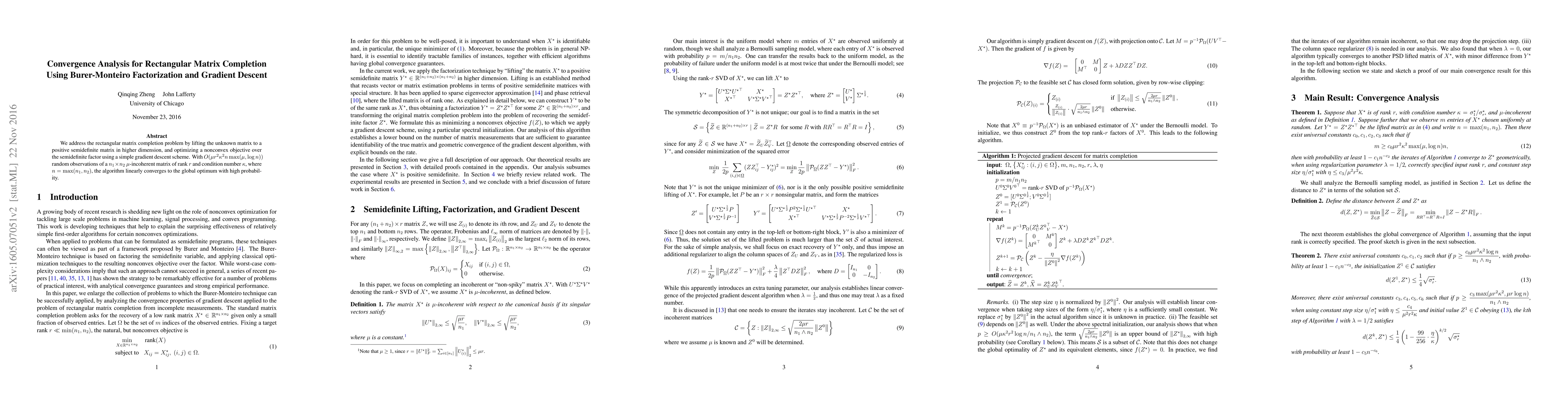 This paper proposes a method for completing rectangular matrices by lifting them to positive semidefinite matrices and optimizing a nonconvex objective using gradient descent. The algorithm converges to the global optimum with high probability using $O( \mu r^2 \kappa^2 n \max(\mu, \log n))$ random observations.