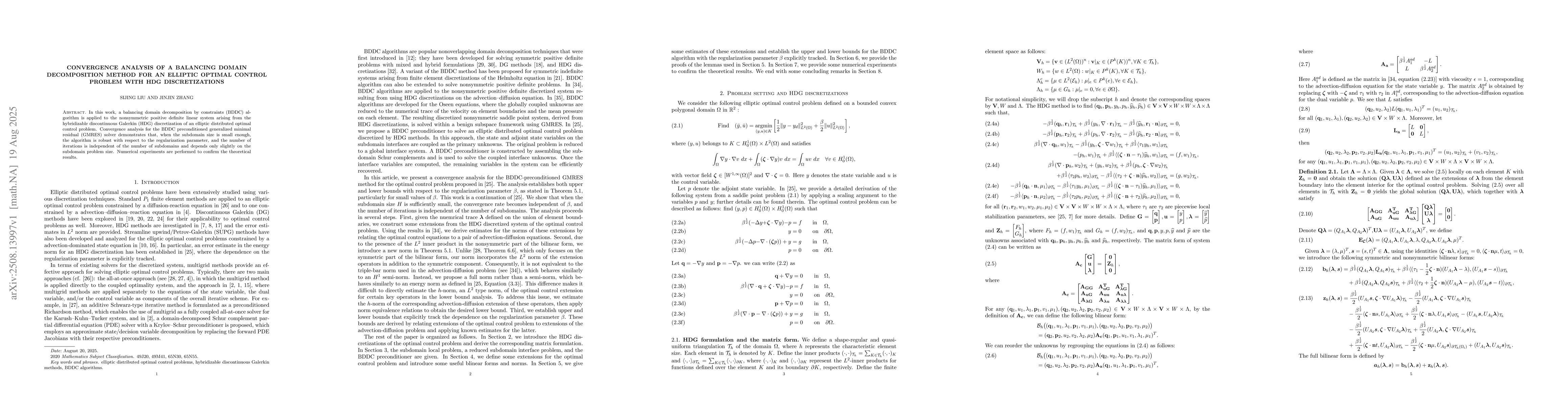In this work, a balancing domain decomposition by constraints (BDDC) algorithm is applied to the nonsymmetric positive definite linear system arising from the hybridizable discontinuous Galerkin (HDG) discretization of an elliptic distributed optimal control problem. Convergence analysis for the BDDC preconditioned generalized minimal residual (GMRES) solver demonstrates that, when the subdomain size is small enough, the algorithm is robust with respect to the regularization parameter, and the number of iterations is independent of the number of subdomains and depends only slightly on the subdomain problem size. Numerical experiments are performed to confirm the theoretical results.