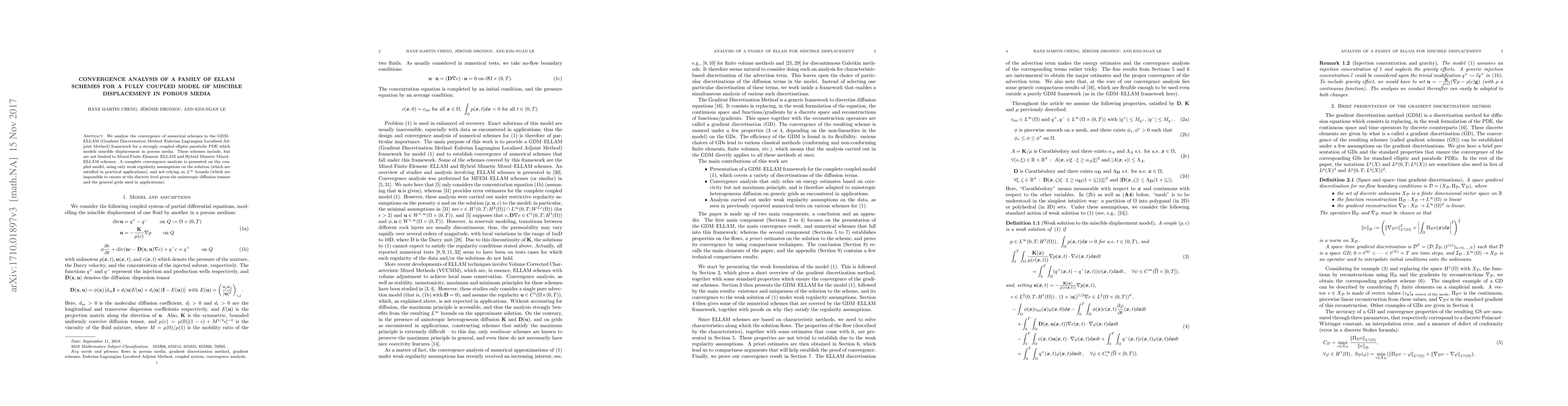 We analyse the convergence of numerical schemes in the GDM-ELLAM (Gradient Discretisation Method-Eulerian Lagrangian Localised Adjoint Method) framework for a strongly coupled elliptic-parabolic PDE which models miscible displacement in porous media. These schemes include, but are not limited to Mixed Finite Element-ELLAM and Hybrid Mimetic Mixed-ELLAM schemes. A complete convergence analysis is presented on the coupled model, using only weak regularity assumptions on the solution (which are satisfied in practical applications), and not relying on $L^\infty$ bounds (which are impossible to ensure at the discrete level given the anisotropic diffusion tensors and the general grids used in applications).