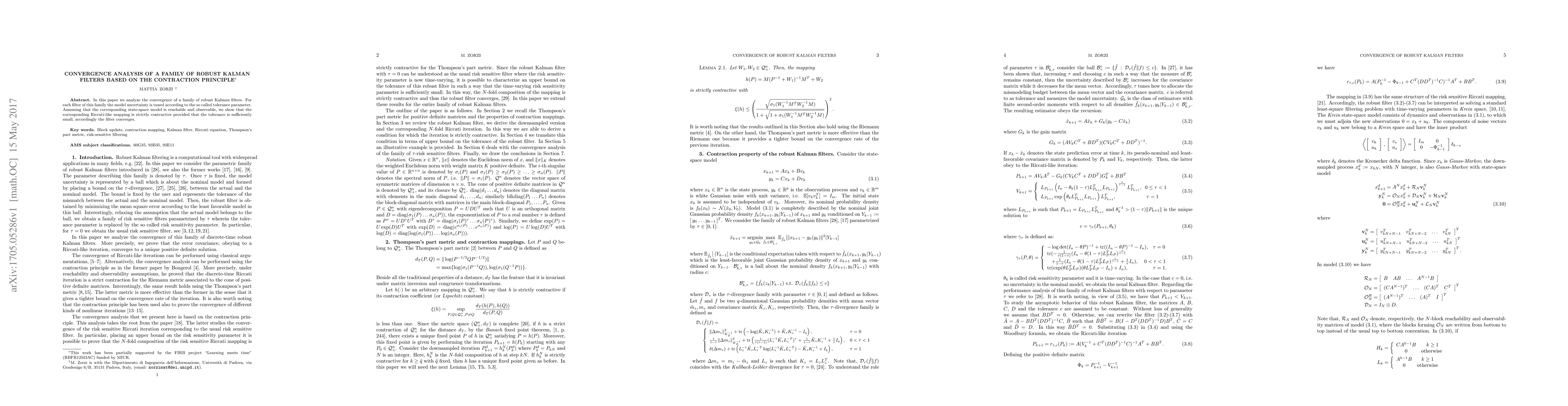 This research paper analyzes a family of robust Kalman filters, demonstrating their convergence using the contraction principle. It shows that with a small tolerance parameter, the Riccati-like mapping becomes strictly contractive, ensuring filter convergence, given the system's reachability and observability.