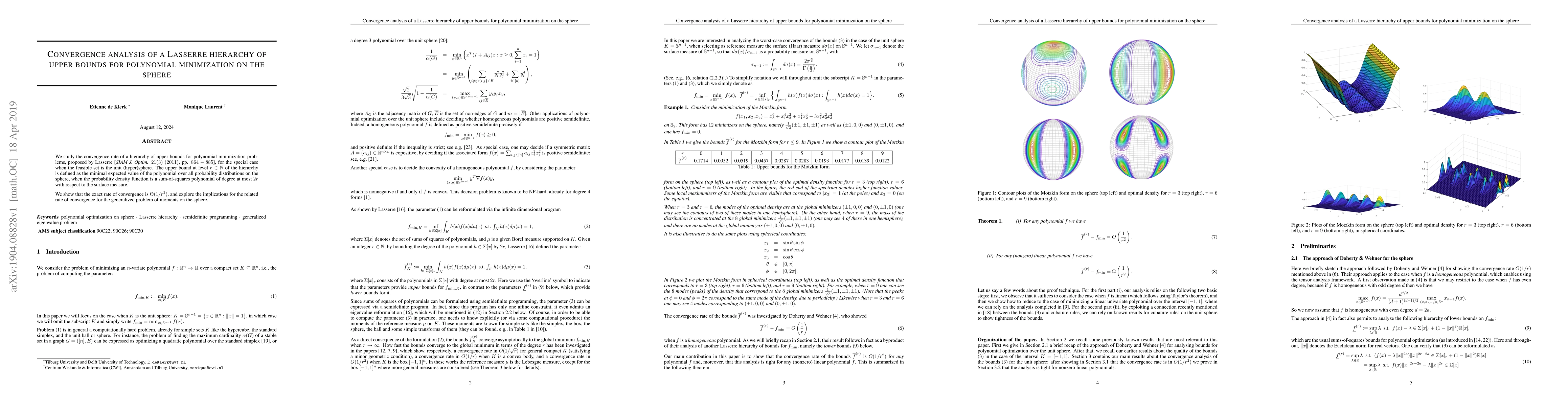 We study the convergence rate of a hierarchy of upper bounds for polynomial minimization problems, proposed by Lasserre [SIAM J. Optim. 21(3) (2011), pp. 864-885], for the special case when the feasible set is the unit (hyper)sphere. The upper bound at level r of the hierarchy is defined as the minimal expected value of the polynomial over all probability distributions on the sphere, when the probability density function is a sum-of-squares polynomial of degree at most 2r with respect to the surface measure. We show that the exact rate of convergence is Theta(1/r^2), and explore the implications for the related rate of convergence for the generalized problem of moments on the sphere.