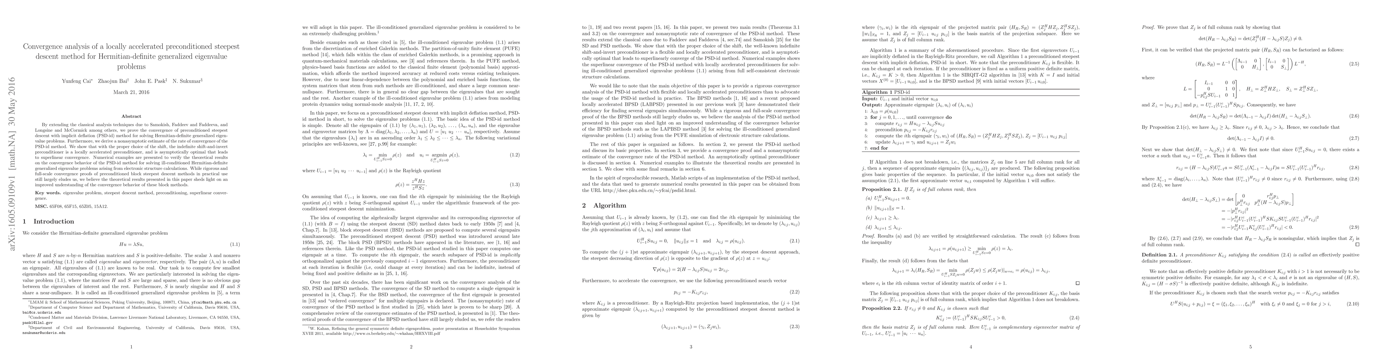 This paper proves the convergence of a preconditioned steepest descent method with implicit deflation for solving Hermitian-definite generalized eigenvalue problems, deriving a nonasymptotic rate of convergence estimate. The indefinite shift-and-invert preconditioner is shown to be locally accelerated and asymptotically optimal, leading to superlinear convergence.