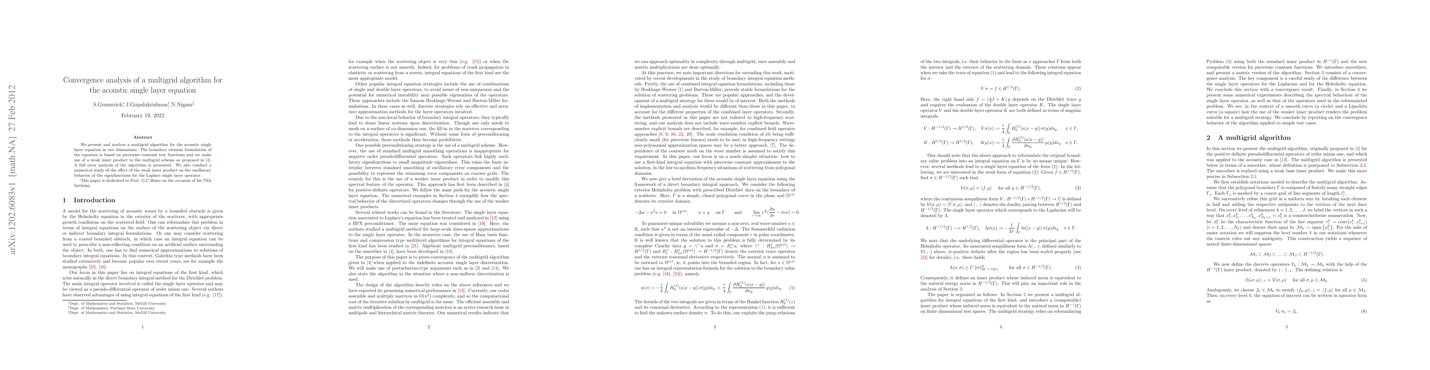 We present and analyze a multigrid algorithm for the acoustic single layer equation in two dimensions. The boundary element formulation of the equation is based on piecewise constant test functions and we make use of a weak inner product in the multigrid scheme as proposed in \cite{BLP94}. A full error analysis of the algorithm is presented. We also conduct a numerical study of the effect of the weak inner product on the oscillatory behavior of the eigenfunctions for the Laplace single layer operator.
