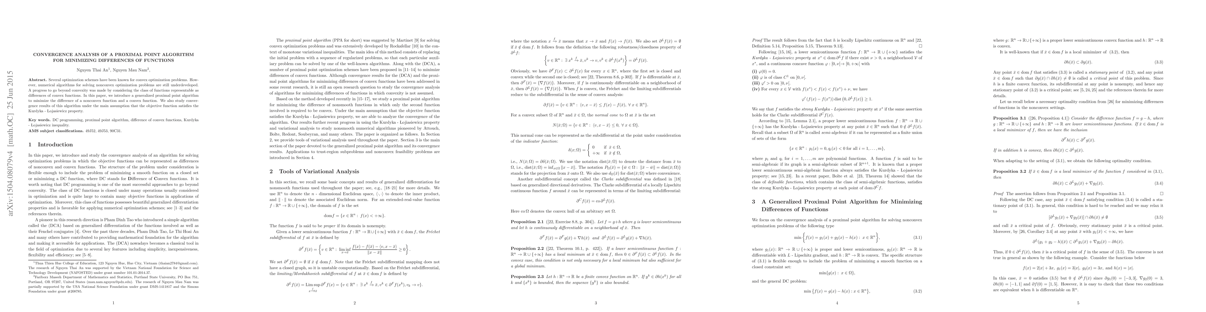 The paper presents a novel convergence analysis for a proximal point algorithm tailored for minimizing differences of functions, where one function can be nonconvex, leveraging the Kurdyka-Łojasiewicz property.