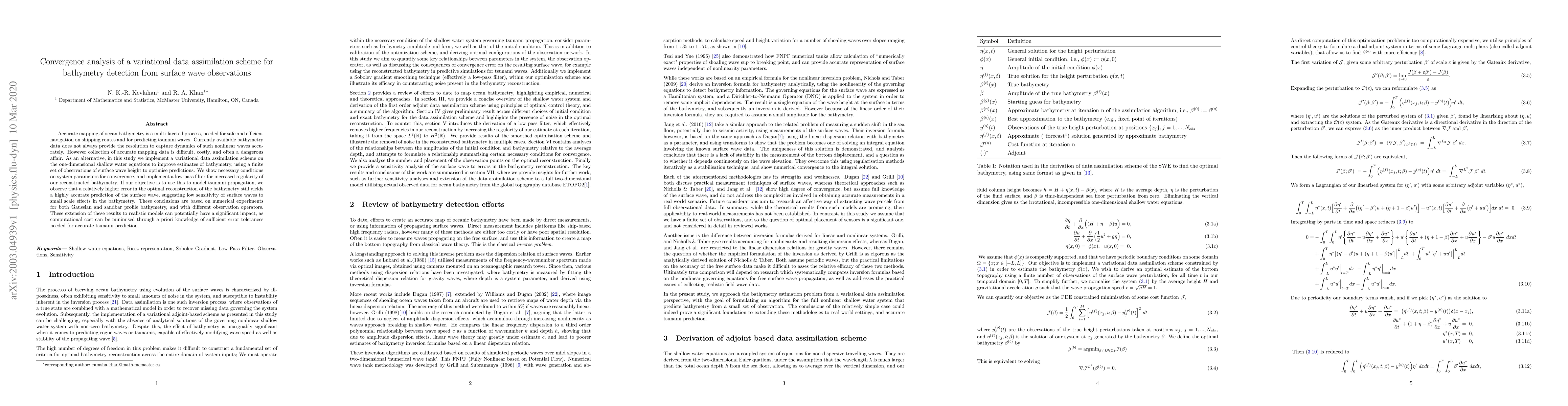 Accurate mapping of ocean bathymetry is a multi-faceted process, needed for safe and efficient navigation on shipping routes and for predicting tsunami waves. Currently available bathymetry data does not always provide the resolution to capture dynamics of such nonlinear waves accurately. However collection of accurate mapping data is difficult, costly, and often a dangerous affair. As an alternative, in this study we implement a variational data assimilation scheme on the one-dimensional shallow water equations to improve estimates of bathymetry, using a finite set of observations of surface wave height to optimise predictions. We show necessary conditions on system parameters for convergence, and implement a low-pass filter for increased regularity of our reconstructed bathymetry. If our objective is to use this to model tsunami propagation, we observe that a relatively higher error in the optimal reconstruction of the bathymetry still yields a highly accurate prediction of the surface wave, suggesting low sensitivity of surface waves to small scale effects in the bathymetry. These conclusions are based on numerical experiments for both Gaussian and sandbar profile bathymetry, and with different observation operators.These extension of these results to realistic models can potentially have a significant impact, as computational cost can be minimised through a priori knowledge of sufficient error tolerances needed for accurate tsunami prediction.