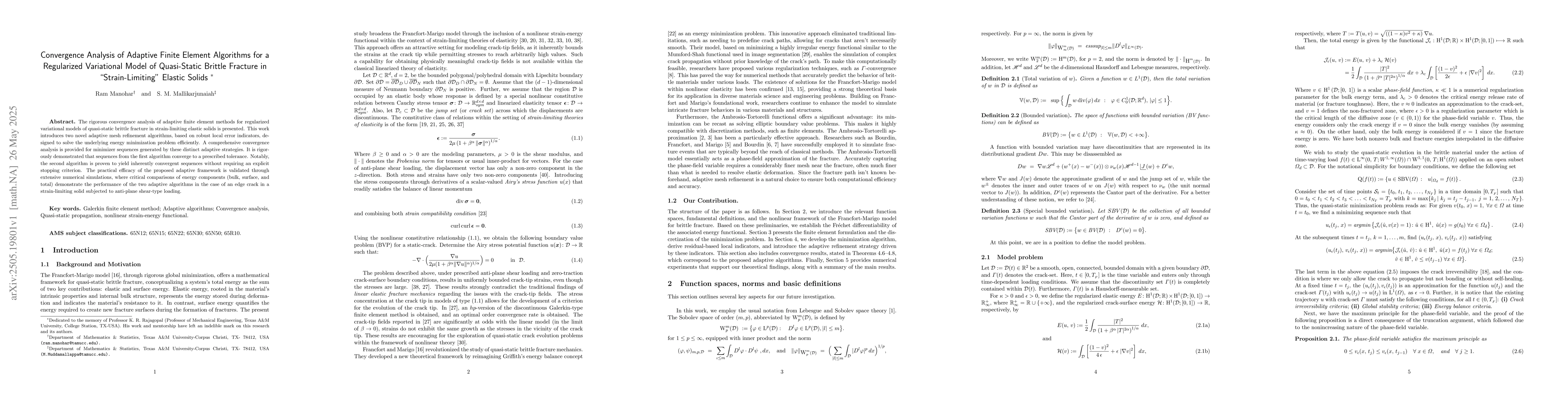 The research presents adaptive finite element methods for regularized variational models of quasi-static brittle fracture in strain-limiting elastic solids, introducing two novel mesh refinement algorithms based on robust local error indicators.