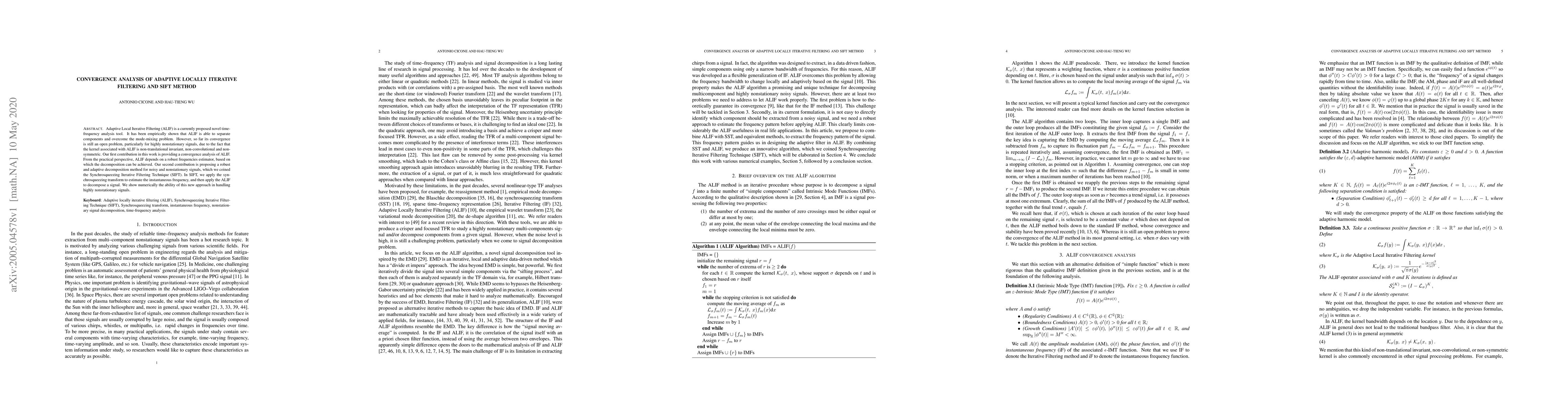 This paper provides a convergence analysis of Adaptive Local Iterative Filtering (ALIF) and introduces the Synchrosqueezing Iterative Filtering Technique (SIFT) for decomposing noisy and nonstationary signals. The SIFT combines ALIF with a robust frequency estimator for effective signal decomposition.