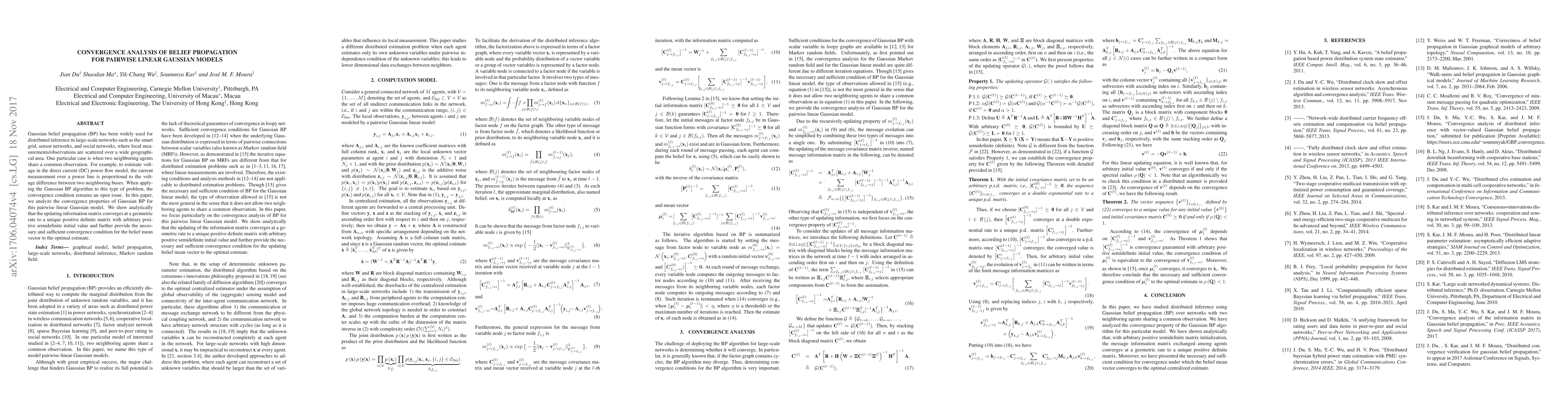 This paper analyzes the convergence properties of Gaussian belief propagation (BP) for pairwise linear Gaussian models, demonstrating that the updating information matrix converges geometrically to a unique positive definite matrix. It also provides the necessary and sufficient condition for the belief mean vector to converge to the optimal estimate.