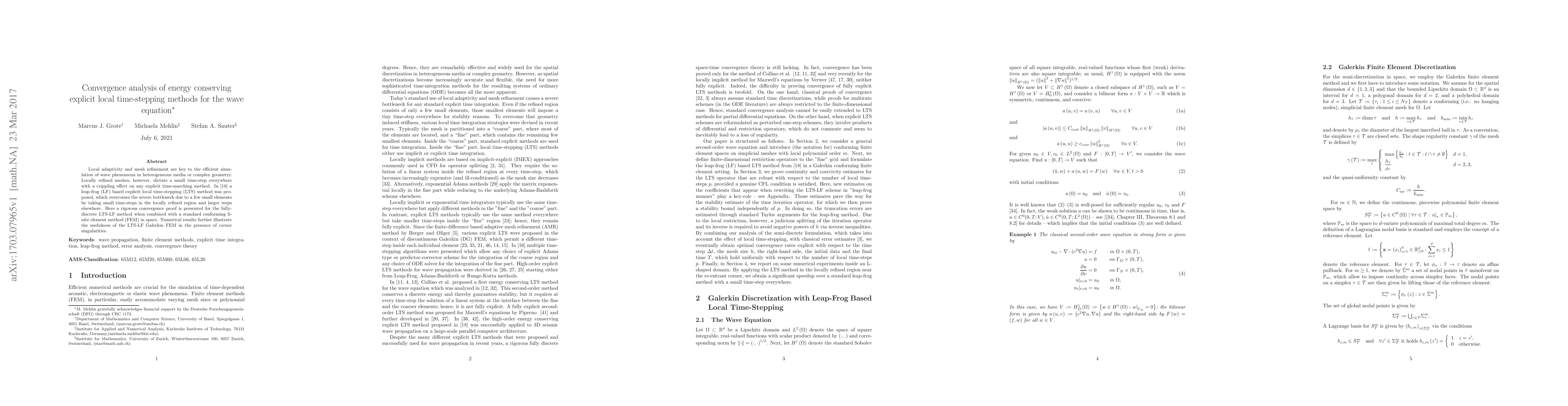This paper rigorously proves the convergence of an explicit local time-stepping method based on the leap-frog scheme for solving the wave equation, demonstrating its effectiveness in overcoming the small time-step limitations in locally refined meshes. Numerical results show its utility in handling complex geometries with corner singularities.