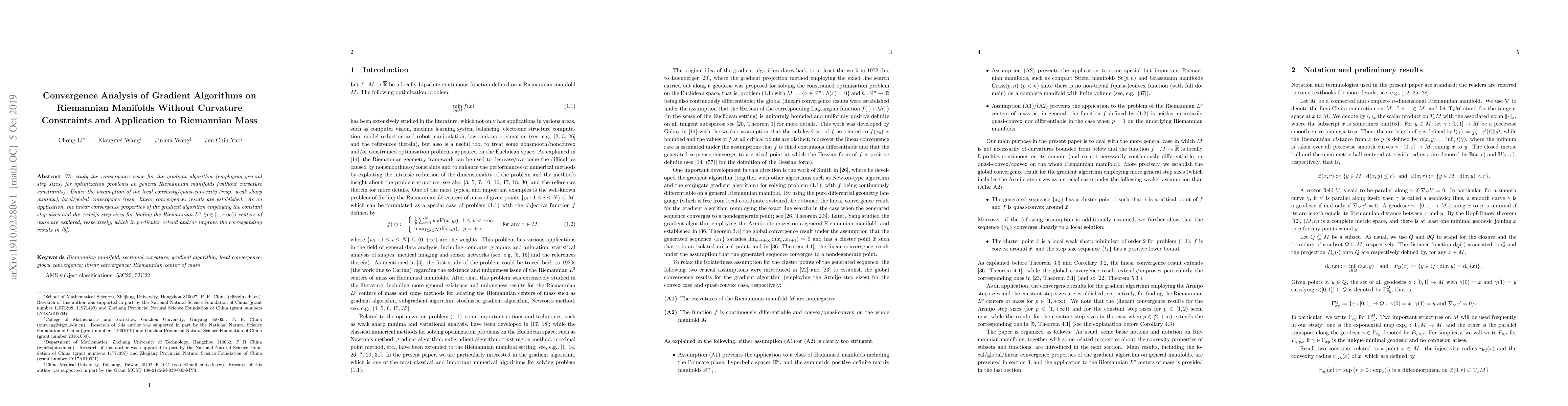 This paper investigates the convergence of gradient algorithms on Riemannian manifolds without curvature constraints, proving local/global convergence under local convexity/quasi-convexity assumptions. It applies these findings to the computation of Riemannian $L^p$ centers of mass, extending previous results.