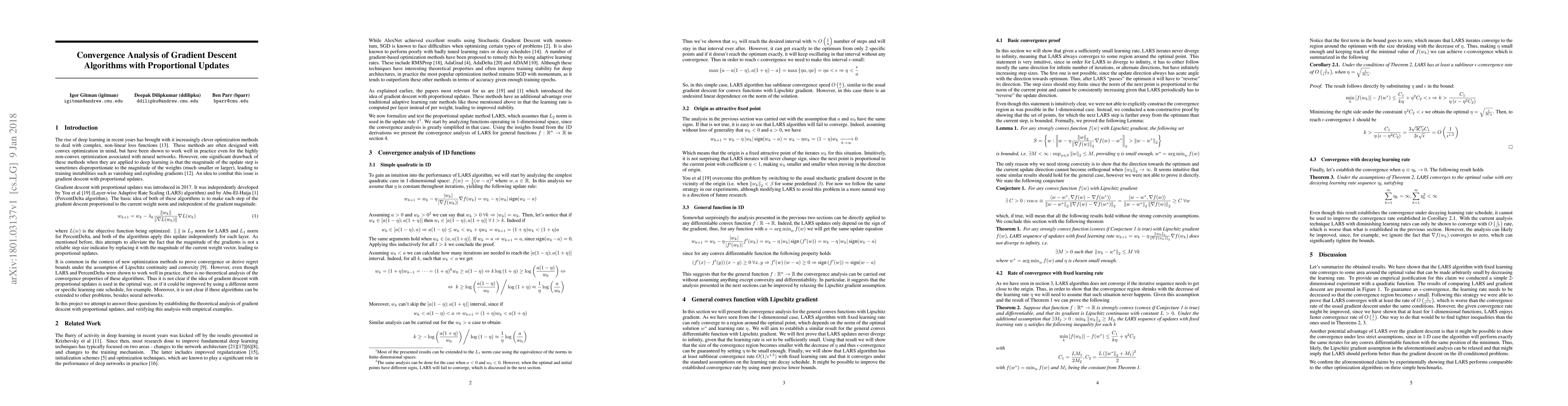 This paper investigates the convergence properties of gradient descent algorithms with proportional updates, such as LARS and PercentDelta, which adjust the update step size relative to the current weight norm to stabilize training. It aims to theoretically analyze these methods' convergence and their potential extensions beyond neural networks, supplemented by empirical validation.