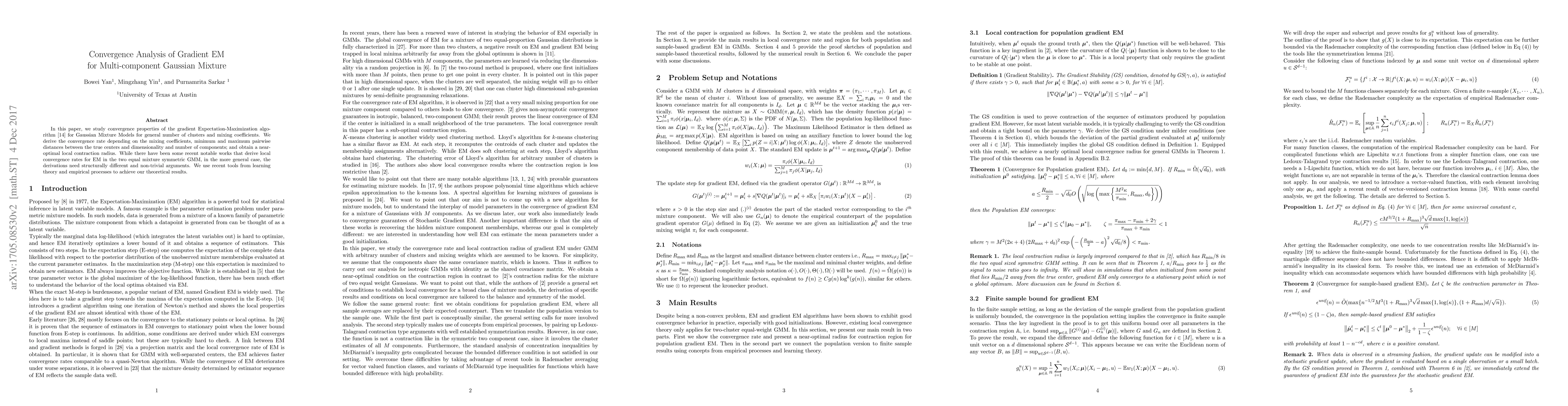 This paper analyzes the convergence properties of the gradient Expectation-Maximization algorithm for Gaussian Mixture Models, deriving a convergence rate dependent on mixing coefficients and other parameters. It employs advanced tools from learning theory to achieve near-optimal results for general cases beyond symmetric two-component mixtures.