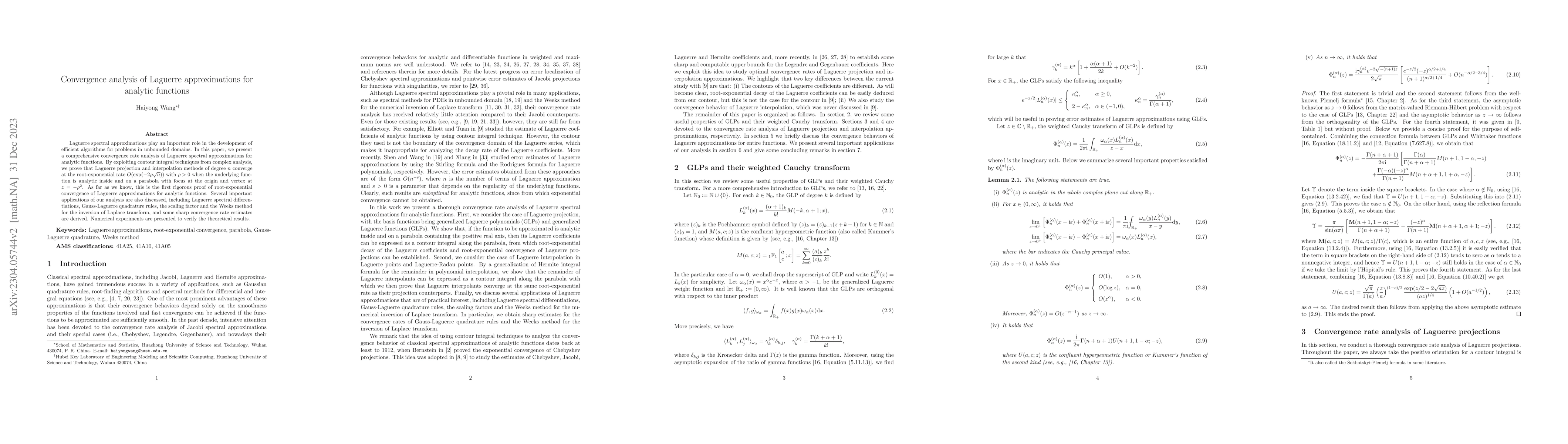 This paper provides a rigorous convergence rate analysis for Laguerre spectral approximations of analytic functions, proving root-exponential convergence at the rate $O(\exp(-2\rho\sqrt{n}))$ for functions analytic inside and on a specific parabolic contour. The analysis also discusses applications and verifies theoretical results with numerical experiments.