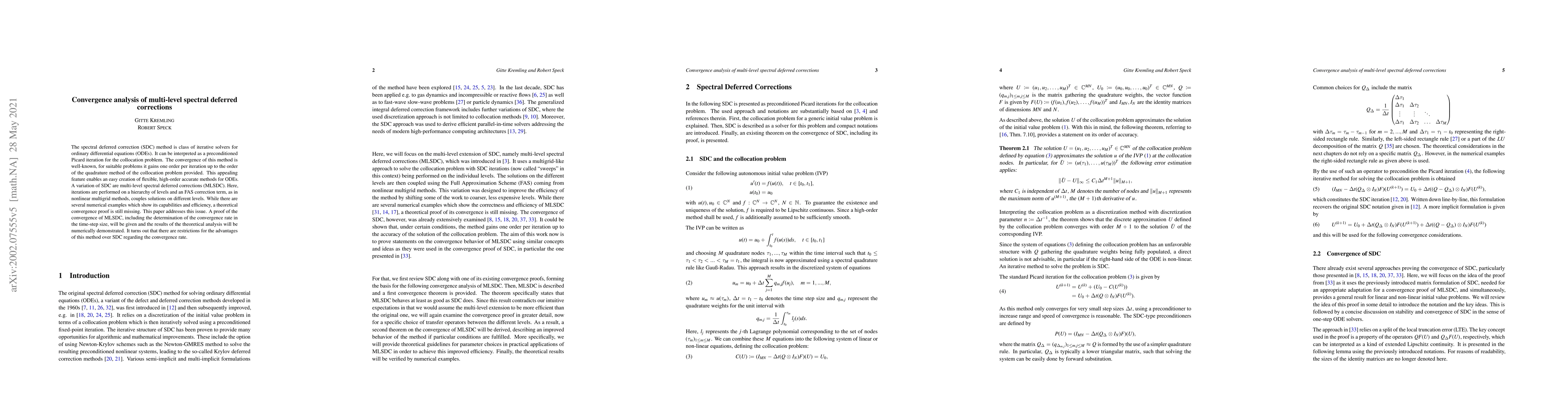This paper provides a theoretical convergence proof for multi-level spectral deferred corrections (MLSDC), establishing the convergence rate in relation to the time-step size. It demonstrates that while MLSDC offers flexibility and high-order accuracy, its convergence benefits over the standard spectral deferred correction (SDC) method are limited.