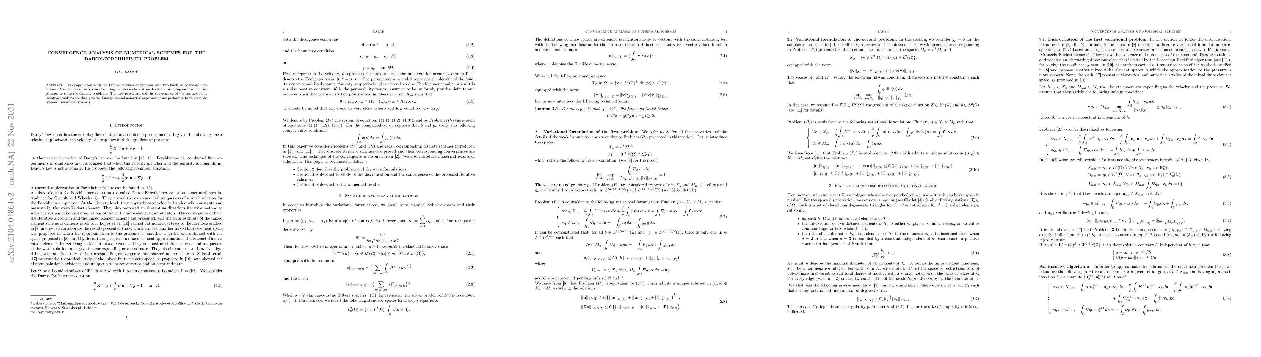 This paper analyzes numerical schemes for solving the Darcy-Forchheimer problem, proving convergence and validating their performance through numerical experiments.