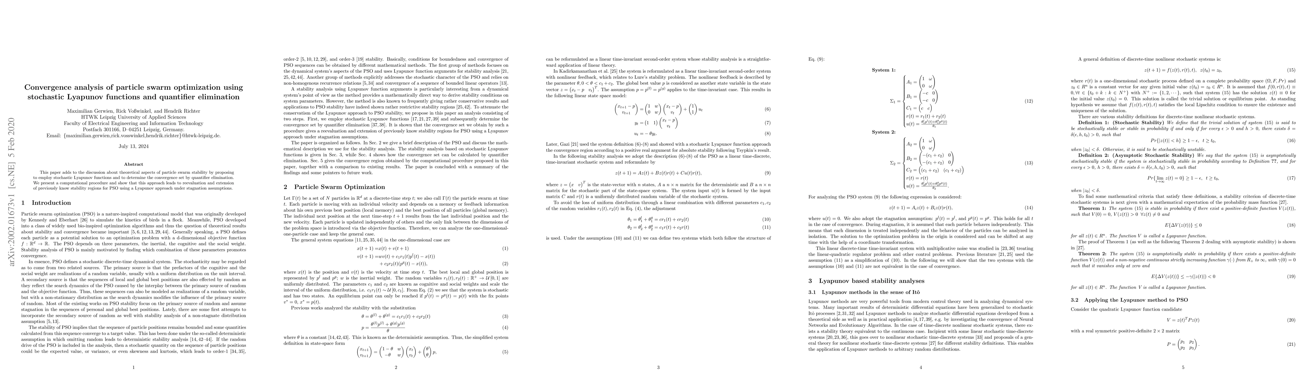 This paper proposes using stochastic Lyapunov functions to analyze particle swarm optimization stability and determines convergence regions through quantifier elimination, leading to reevaluation of previously known stability regions.