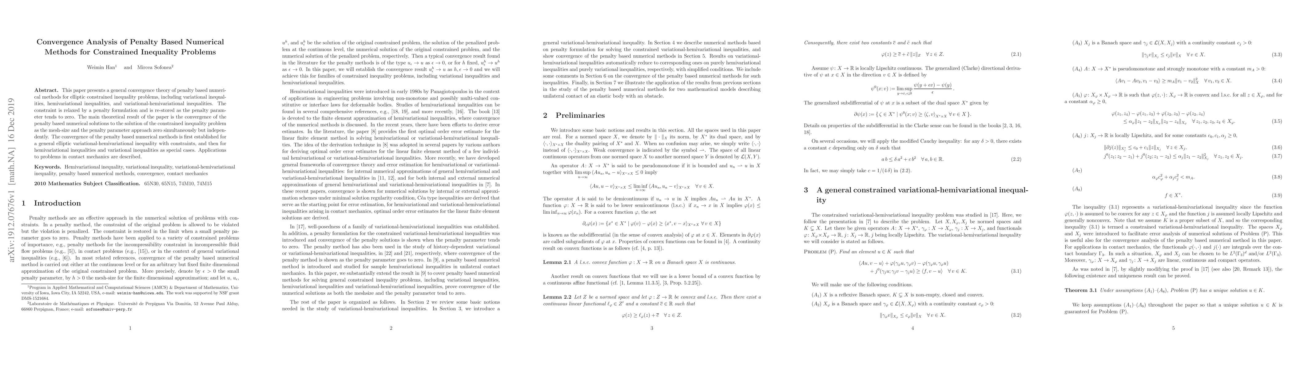 This paper develops a convergence theory for penalty-based numerical methods addressing elliptic constrained inequality problems, including variational and hemivariational inequalities. It proves the convergence of these methods to the true solution as the penalty parameter and mesh size approach zero independently.