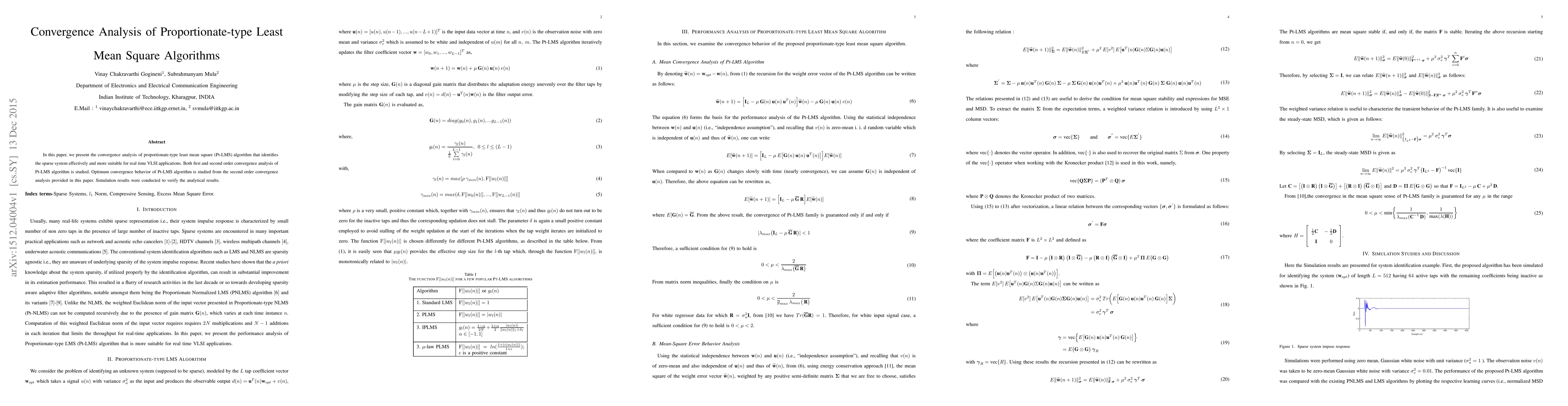 This paper analyzes the convergence of a proportionate-type least mean square algorithm, finding it to be more suitable for real-time VLSI applications due to its sparse system identification capabilities.