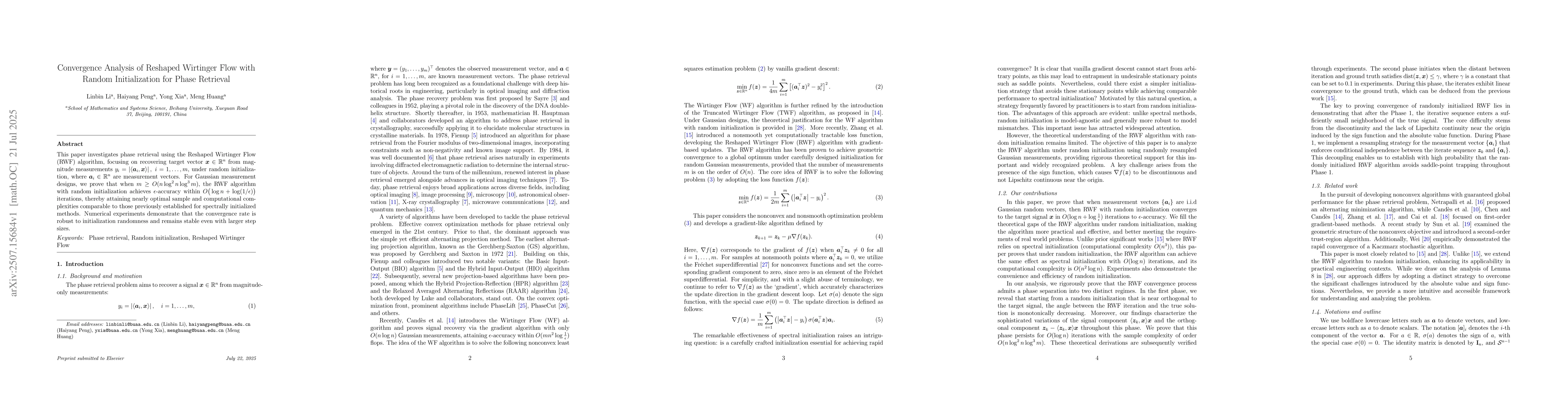 The paper presents a convergence analysis of the Reshaped Wirtinger Flow algorithm with random initialization for phase retrieval, proving its efficiency in terms of sample and computational complexities.