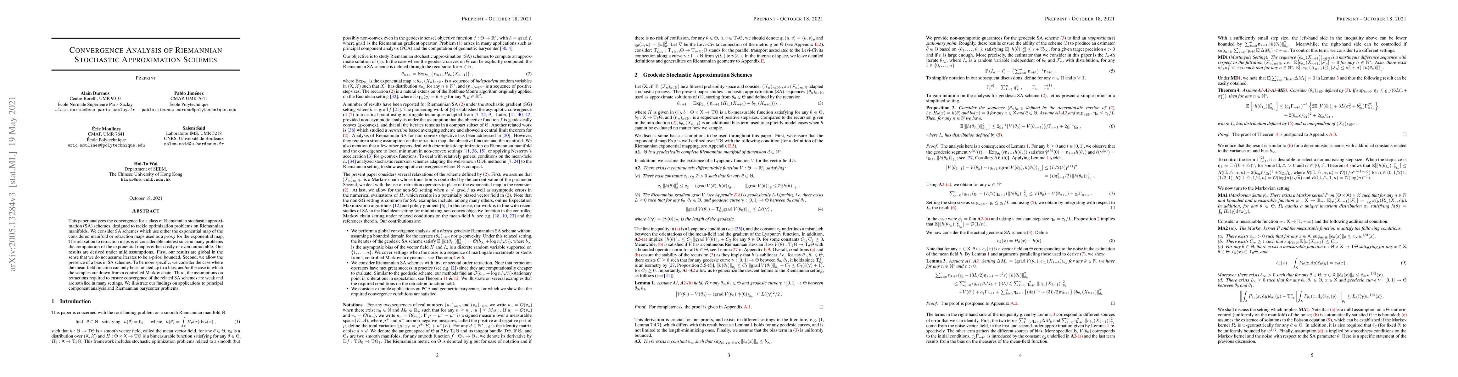 This paper analyzes the convergence for a large class of Riemannian stochastic approximation (SA) schemes, which aim at tackling stochastic optimization problems. In particular, the recursions we study use either the exponential map of the considered manifold (geodesic schemes) or more general retraction functions (retraction schemes) used as a proxy for the exponential map. Such approximations are of great interest since they are low complexity alternatives to geodesic schemes. Under the assumption that the mean field of the SA is correlated with the gradient of a smooth Lyapunov function (possibly non-convex), we show that the above Riemannian SA schemes find an ${\mathcal{O}}(b_\infty + \log n / \sqrt{n})$-stationary point (in expectation) within ${\mathcal{O}}(n)$ iterations, where $b_\infty \geq 0$ is the asymptotic bias. Compared to previous works, the conditions we derive are considerably milder. First, all our analysis are global as we do not assume iterates to be a-priori bounded. Second, we study biased SA schemes. To be more specific, we consider the case where the mean-field function can only be estimated up to a small bias, and/or the case in which the samples are drawn from a controlled Markov chain. Third, the conditions on retractions required to ensure convergence of the related SA schemes are weak and hold for well-known examples. We illustrate our results on three machine learning problems.