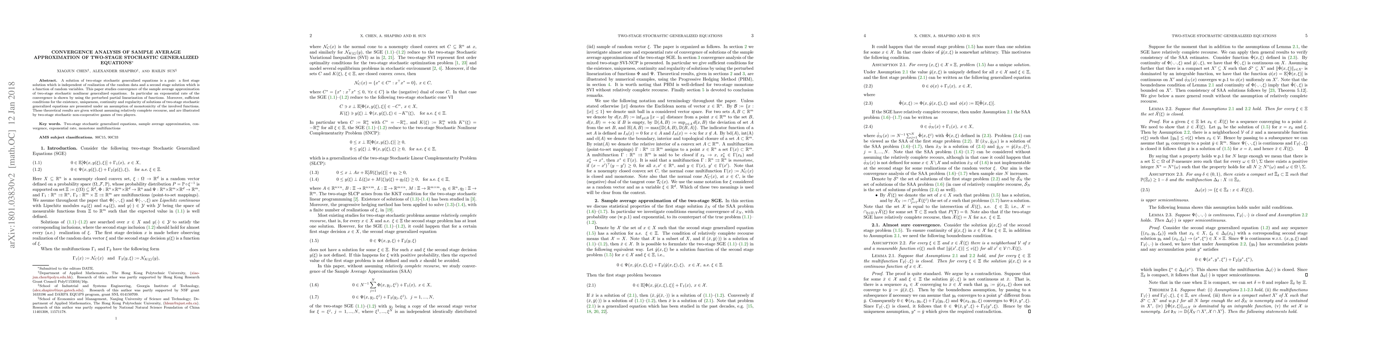 This paper investigates the convergence of the sample average approximation for two-stage stochastic nonlinear generalized equations, demonstrating an exponential rate of convergence via perturbed partial linearization. It also provides sufficient conditions for the existence, uniqueness, continuity, and regularity of solutions under monotonicity assumptions, illustrated through two-stage stochastic non-cooperative games.