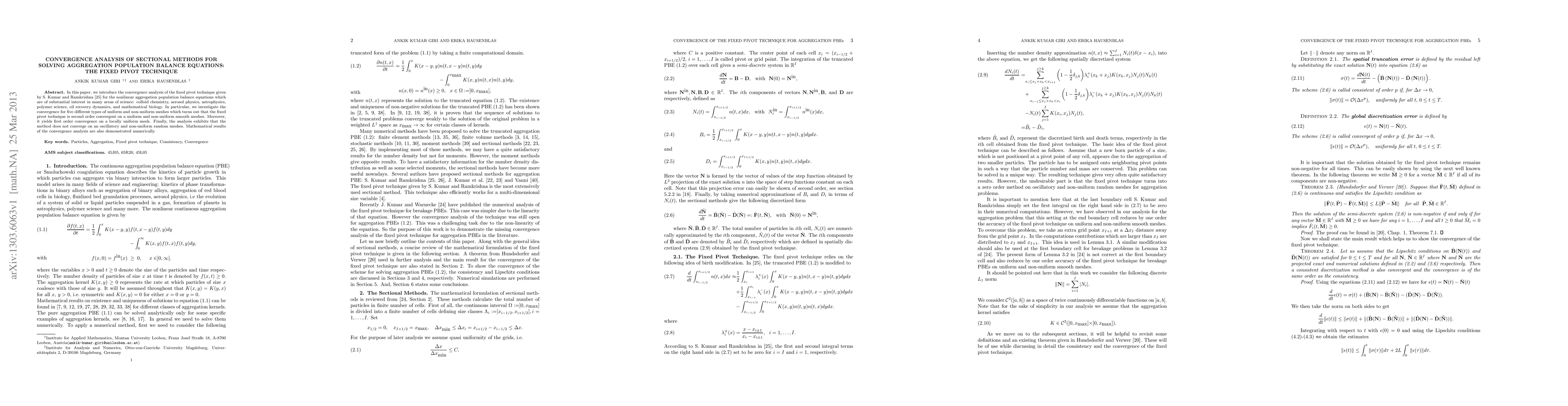 This paper analyzes the convergence of the fixed pivot technique for solving nonlinear aggregation population balance equations, showing second-order convergence on smooth meshes and first-order convergence on locally uniform meshes, while it fails to converge on oscillatory and non-uniform random meshes, with numerical demonstrations supporting the mathematical results.
