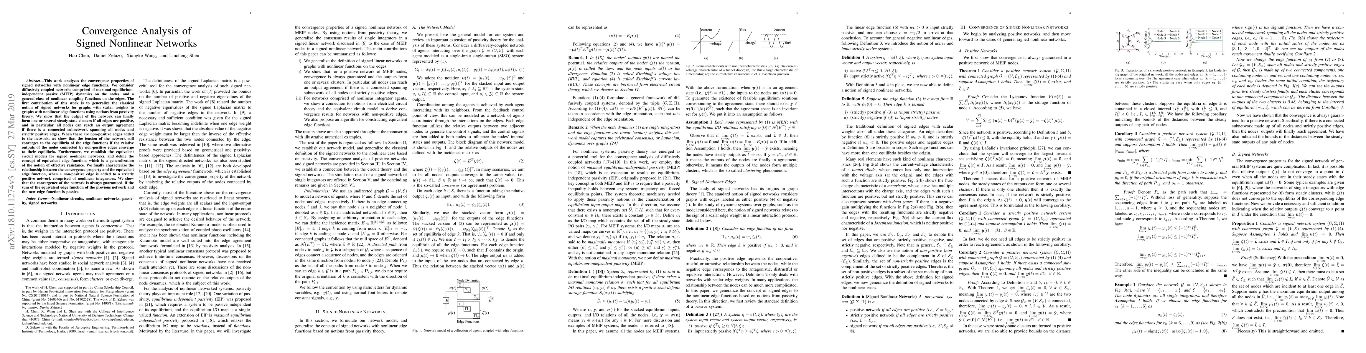 This work analyzes the convergence properties of signed networks with nonlinear edge functions. We consider diffusively coupled networks comprised of maximal equilibrium-independent passive (MEIP) dynamics on the nodes, and a general class of nonlinear coupling functions on the edges. The first contribution of this work is to generalize the classical notion of signed networks for graphs with scalar weights to graphs with nonlinear edge functions using notions from passivity theory. We show that the output of the network can finally form one or several steady-state clusters if all edges are positive, and in particular, all nodes can reach an output agreement if there is a connected subnetwork spanning all nodes and strictly positive edges. When there are non-positive edges added to the network, we show that the tension of the network still converges to the equilibria of the edge functions if the relative outputs of the nodes connected by non-positive edges converge to their equilibria. Furthermore, we establish the equivalent circuit models for signed nonlinear networks, and define the concept of equivalent edge functions which is a generalization of the notion of effective resistance. We finally characterize the relationship between the convergence property and the equivalent edge function, when a non-positive edge is added to a strictly positive network comprised of nonlinear integrators. We show that the convergence of the network is always guaranteed, if the sum of the equivalent edge function of the previous network and the new edge function is passive.