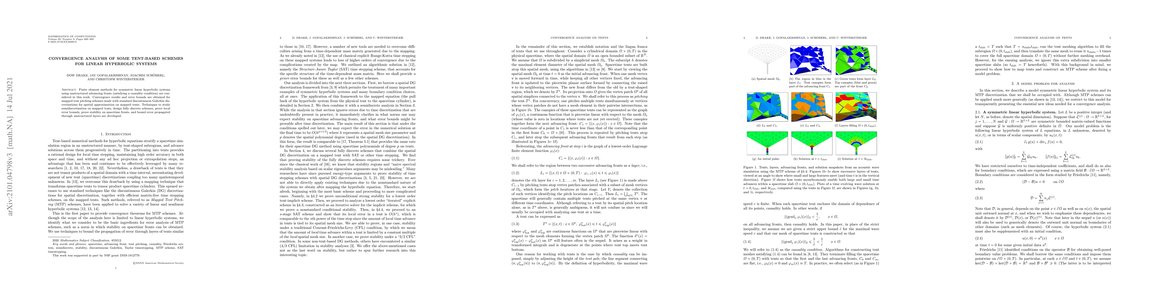 Finite element methods for symmetric linear hyperbolic systems using unstructured advancing fronts (satisfying a causality condition) are considered in this work. Convergence results and error bounds are obtained for mapped tent pitching schemes made with standard discontinuous Galerkin discretizations for spatial approximation on mapped tents. Techniques to study semidiscretization on mapped tents, design fully discrete schemes, prove local error bounds, prove stability on spacetime fronts, and bound error propagated through unstructured layers are developed.