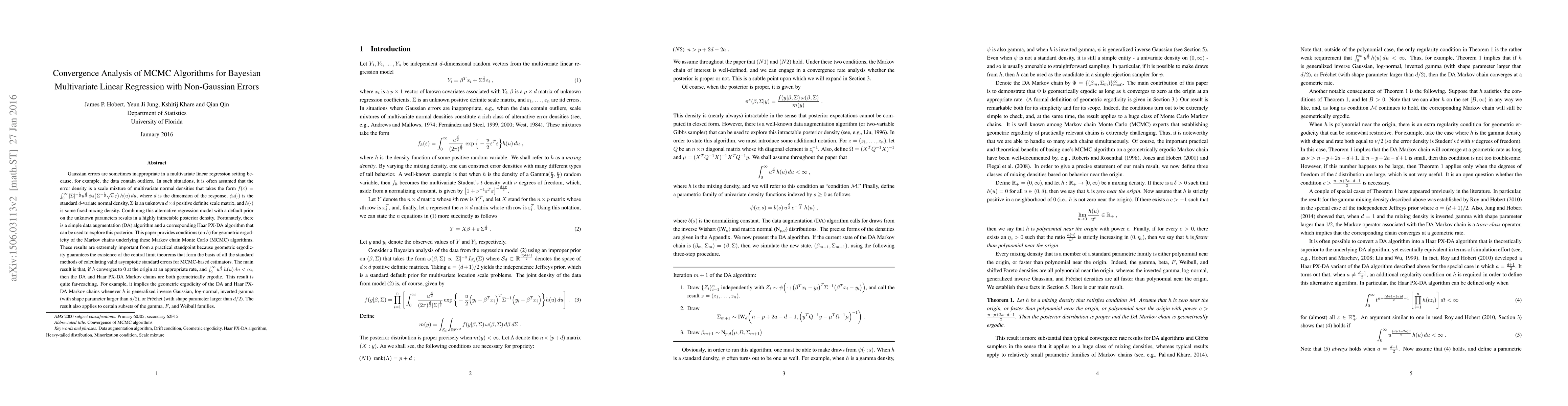This paper investigates the convergence properties of data augmentation algorithms for Bayesian linear regression with non-Gaussian errors, proving conditions for geometric ergodicity of the underlying Markov chains. It establishes that the algorithms are geometrically ergodic under certain conditions on the mixing density, ensuring the validity of asymptotic standard errors for MCMC estimators.