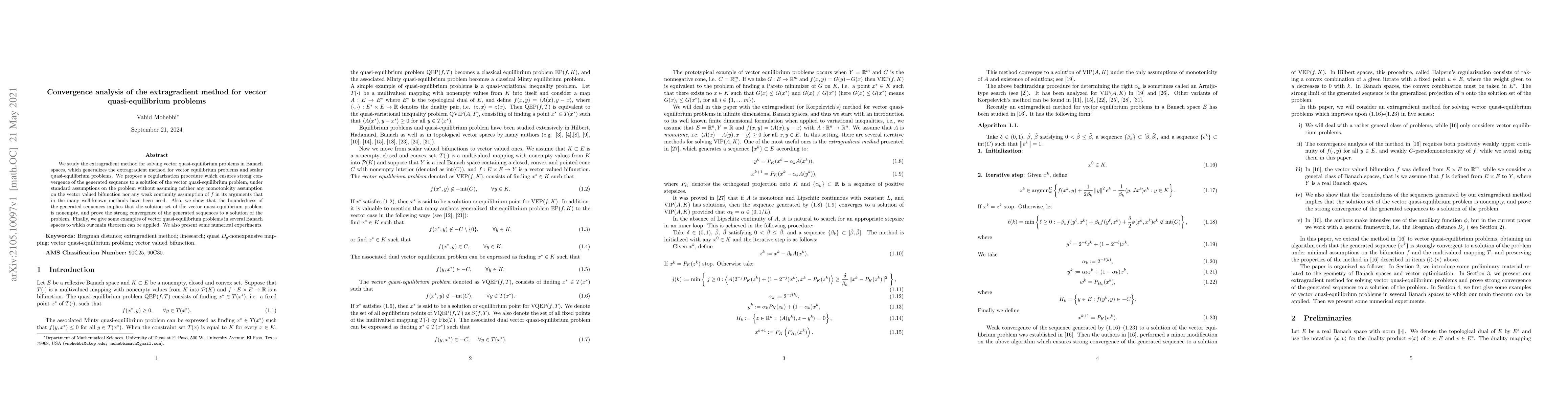 This paper studies the extragradient method for solving vector quasi-equilibrium problems in Banach spaces, proposing a regularization procedure that ensures strong convergence without requiring monotonicity or weak continuity assumptions. The authors demonstrate the nonemptiness of the solution set and provide numerical experiments to validate their approach.