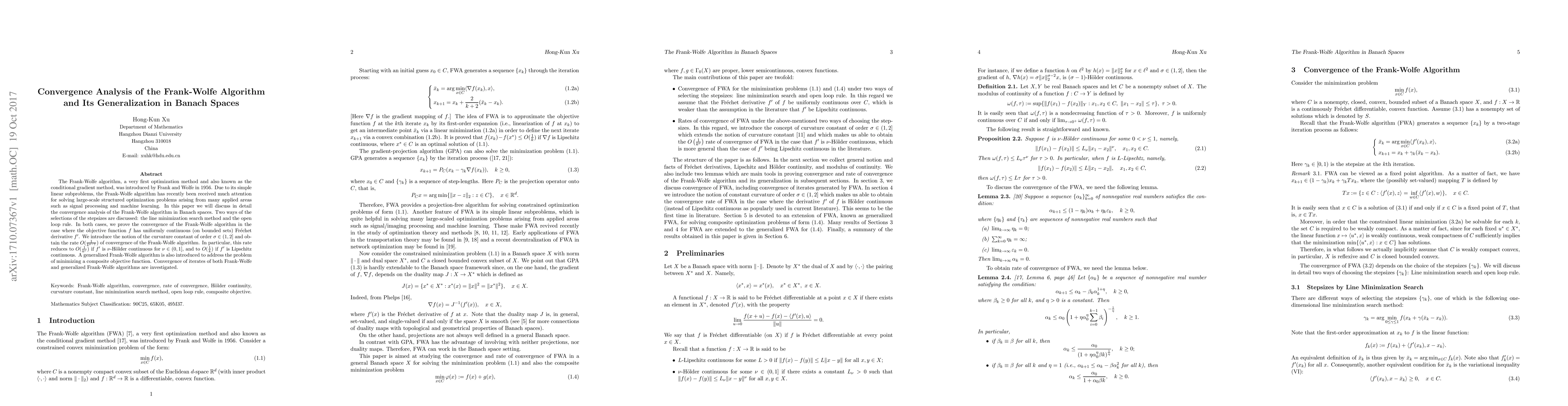 The Frank-Wolfe algorithm, a very first optimization method and also known as the conditional gradient method, was introduced by Frank and Wolfe in 1956. Due to its simple linear subproblems, the Frank-Wolfe algorithm has recently been received much attention for solving large-scale structured optimization problems arising from many applied areas such as signal processing and machine learning. In this paper we will discuss in detail the convergence analysis of the Frank-Wolfe algorithm in Banach spaces. Two ways of the selections of the stepsizes are discussed: the line minimization search method and the open loop rule. In both cases, we prove the convergence of the Frank-Wolfe algorithm in the case where the objective function $f$ has uniformly continuous (on bounded sets) Fr\'echet derivative $f'$. We introduce the notion of the curvature constant of order $\sigma\in (1,2]$ and obtain the rate $O(\frac{1}{k^{\sigma-1}})$ of convergence of the Frank-Wolfe algorithm. In particular, this rate reduces to $O(\frac{1}{k^{\nu}})$ if $f'$ is $\nu$-H\"older continuous for $\nu\in (0,1]$, and to $O(\frac{1}{k})$ if $f'$ is Lipschitz continuous. A generalized Frank-Wolfe algorithm is also introduced to address the problem of minimizing a composite objective function. Convergence of iterates of both Frank-Wolfe and generalized Frank-Wolfe algorithms are investigated.