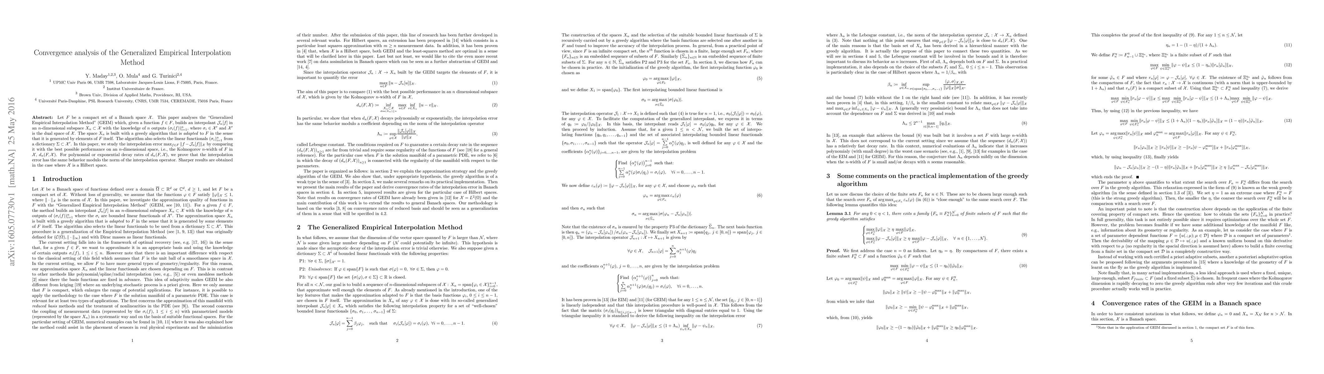 Let $F$ be a compact set of a Banach space $\mathcal{X}$. This paper analyses the "Generalized Empirical Interpolation Method" (GEIM) which, given a function $f\in F$, builds an interpolant $\mathcal{J}_n[f]$ in an $n$-dimensional subspace $X_n \subset \mathcal{X}$ with the knowledge of $n$ outputs $(\sigma_i(f))_{i=1}^n$, where $\sigma_i\in \mathcal{X}'$ and $\mathcal{X}'$ is the dual space of $\mathcal{X}$. The space $X_n$ is built with a greedy algorithm that is adapted to $F$ in the sense that it is generated by elements of $F$ itself. The algorithm also selects the linear functionals $(\sigma_i)_{i=1}^n$ from a dictionary $\Sigma\subset \mathcal{X}'$. In this paper, we study the interpolation error $\max_{f\in F} \Vert f-\mathcal{J}_n[f]\Vert_{\mathcal{X}}$ by comparing it with the best possible performance on an $n$-dimensional space, i.e., the Kolmogorov $n$-width of $F$ in $\mathcal{X}$, $d_n(F,\mathcal{X})$. For polynomial or exponential decay rates of $d_n(F,\mathcal{X})$, we prove that the interpolation error has the same behavior modulo the norm of the interpolation operator. Sharper results are obtained in the case where $\mathcal X$ is a Hilbert space.